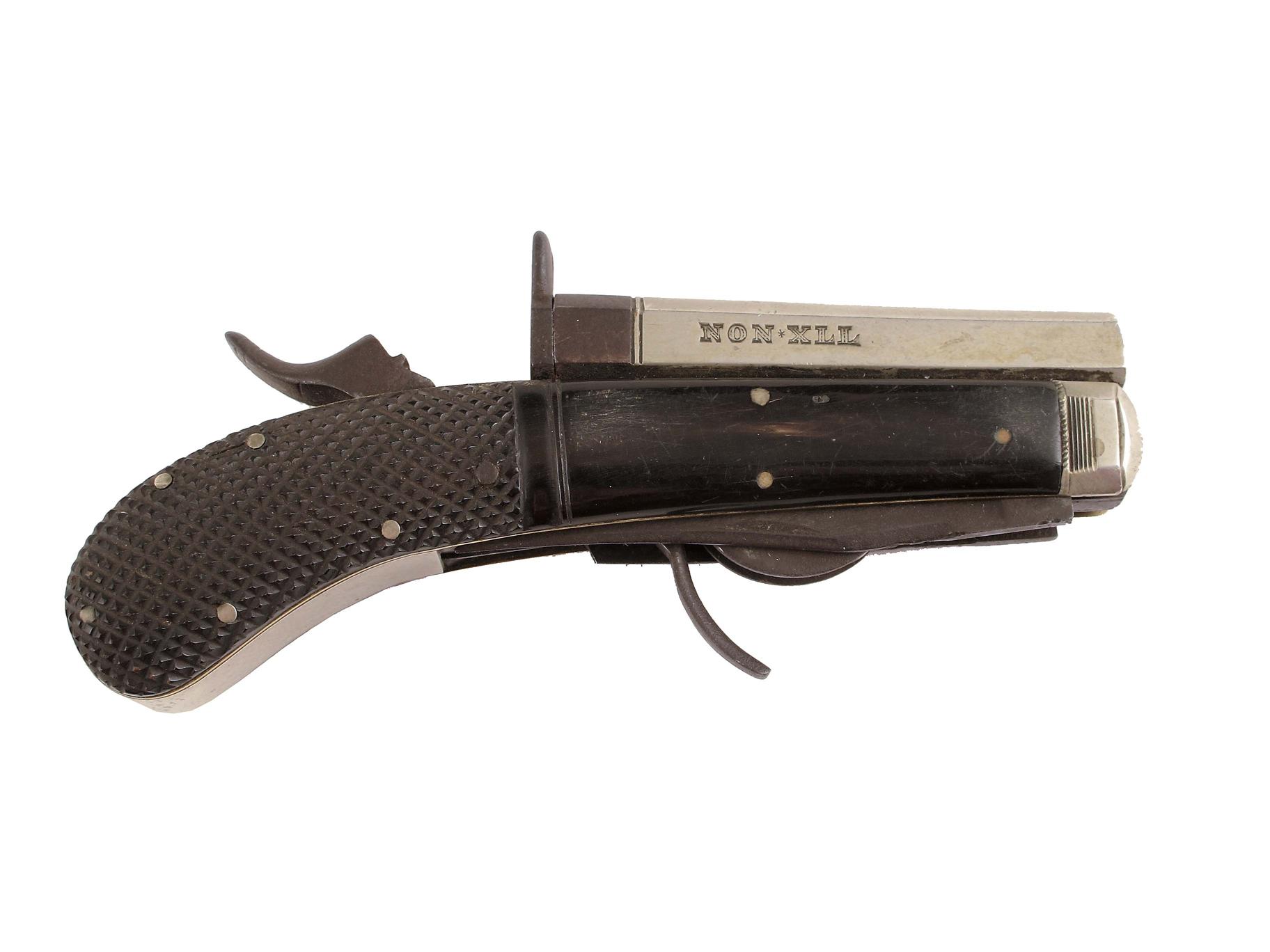 A patent knife pistol by Unwin & Rodgers, Sheffield, with a faceted barrel inscribed 'NON*XLL and UNWIN & RODGERS PATENTEES.SHEFFIELD', horn scales with diaper grips and two folding steel blades, one tip missing, 6.75in (17cm) l.