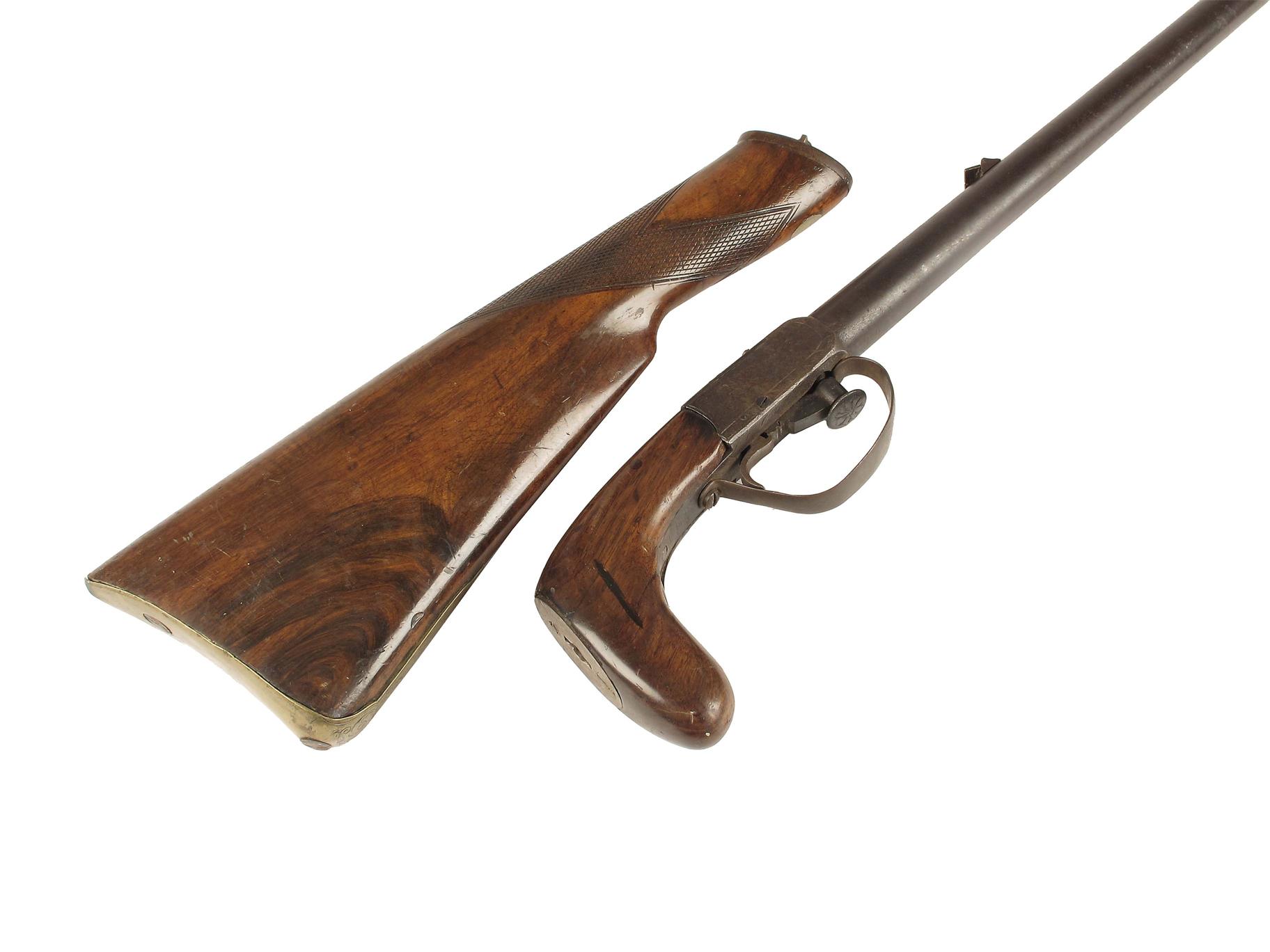 A percussion walking stick rifle, with a 28.75in barrel to an engraved lock and removable walnut stock, mid 19th century, 46in (117cm) l.