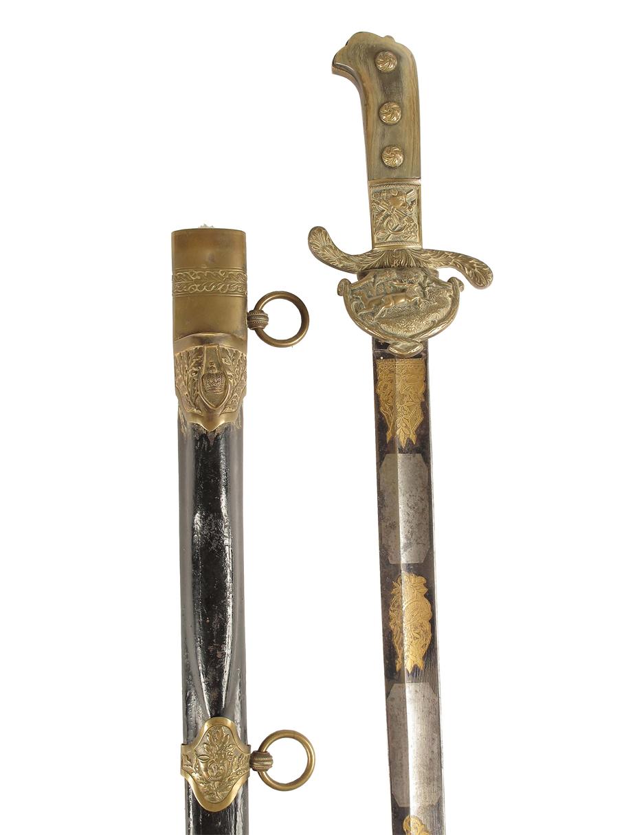 A Bavarian hunting sword, with a fullered steel blade etched with hunting scenes and gilt foliage with a part blued ground, the gilt brass hilt cast hunting trophies to a horn mounted handle,m 30in (76cm) l, in a leather and brass mounted scabbard, the clip with a crown, small knife missing.