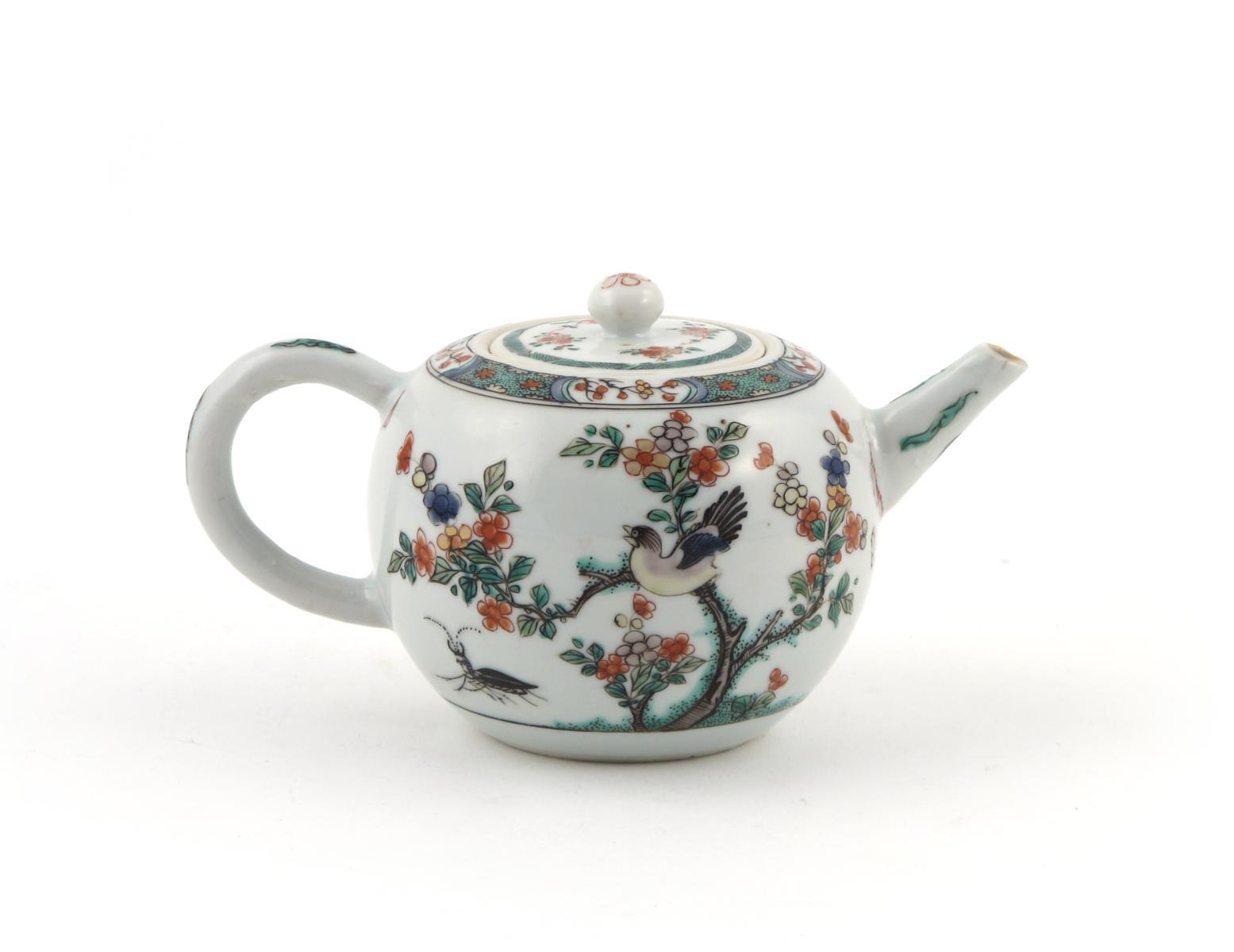 A Chinese famille verte teapot Kangxi 1662-1722, brightly enamelled with birds perched in flowering bushes and with a large black beetle, the cover associated, the handle restored, 21cm. (2)