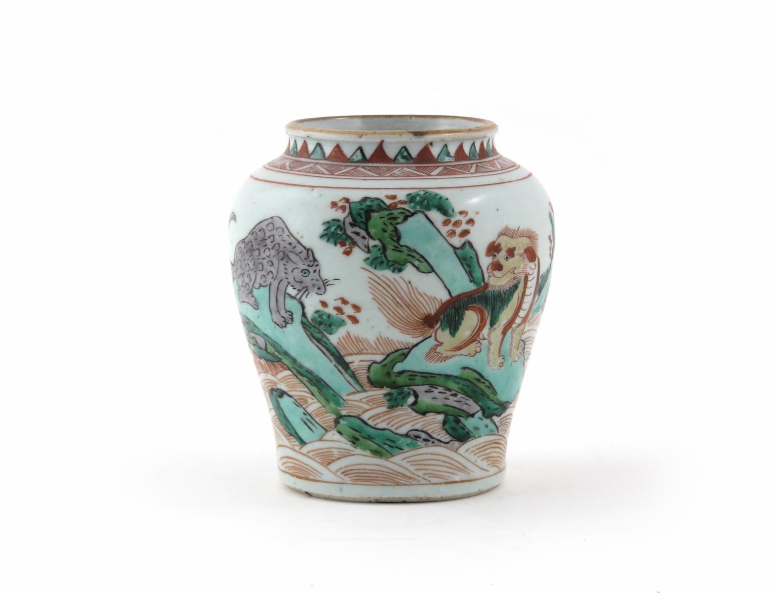 A small Chinese famille verte vase c.1640, painted with a leopard and a lion dog seated on rockwork, a further lion dog swimming amongst waves, 13cm.
