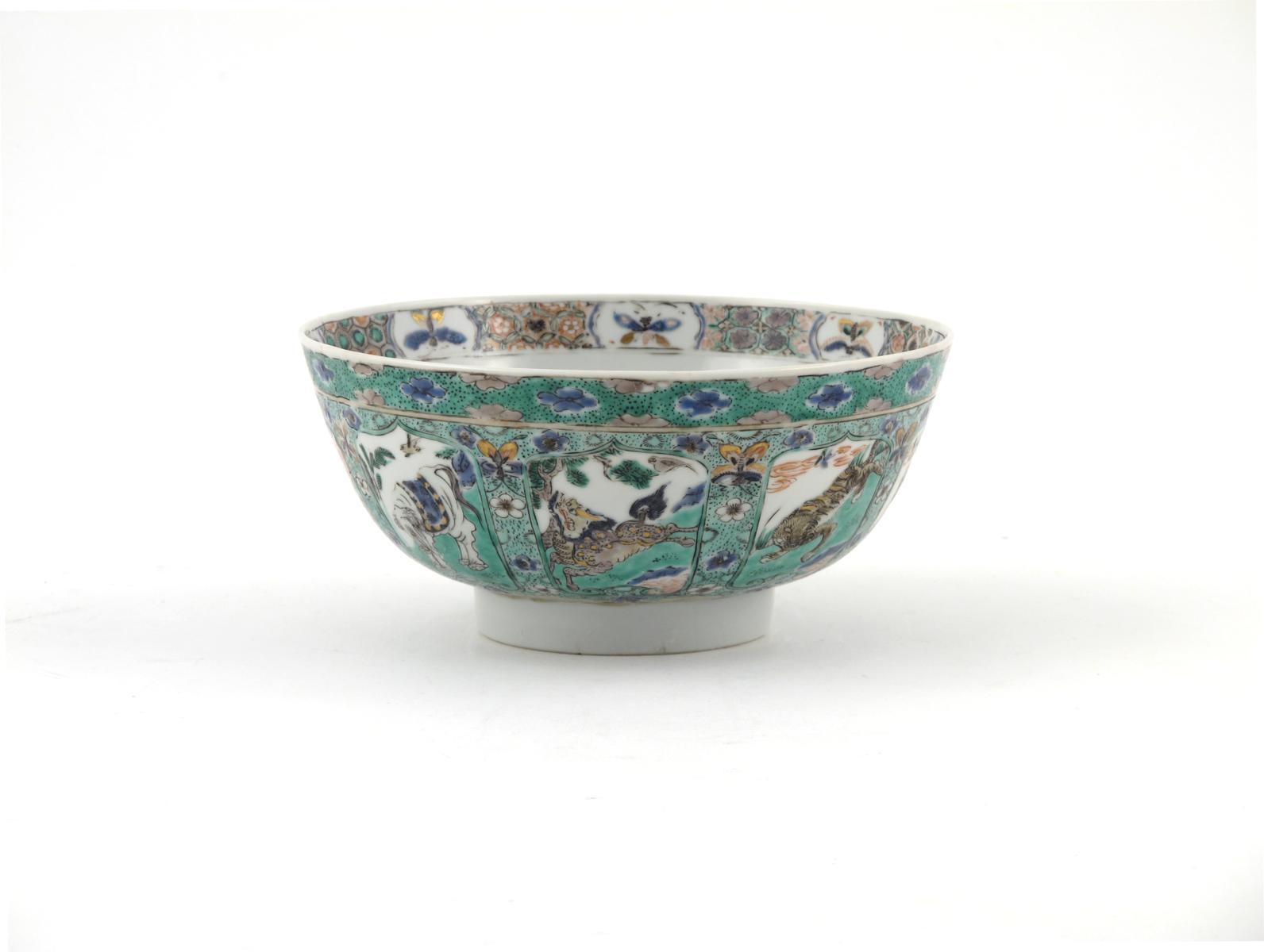 A Chinese famille verte bowl Kangxi 1662-1722, painted with eight panels containing mythical and other animals, the interior with a foliate panel, the base with a painted lozenge mark, cracked and with a rim section repaired, 18.8cm.
