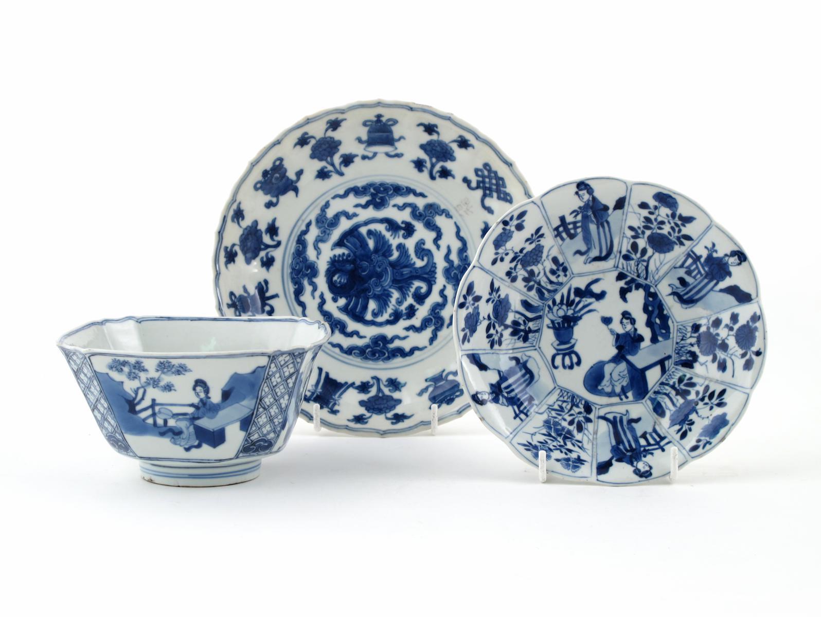 A Chinese blue and white square bowl and two dishes Kangxi 1662-1722