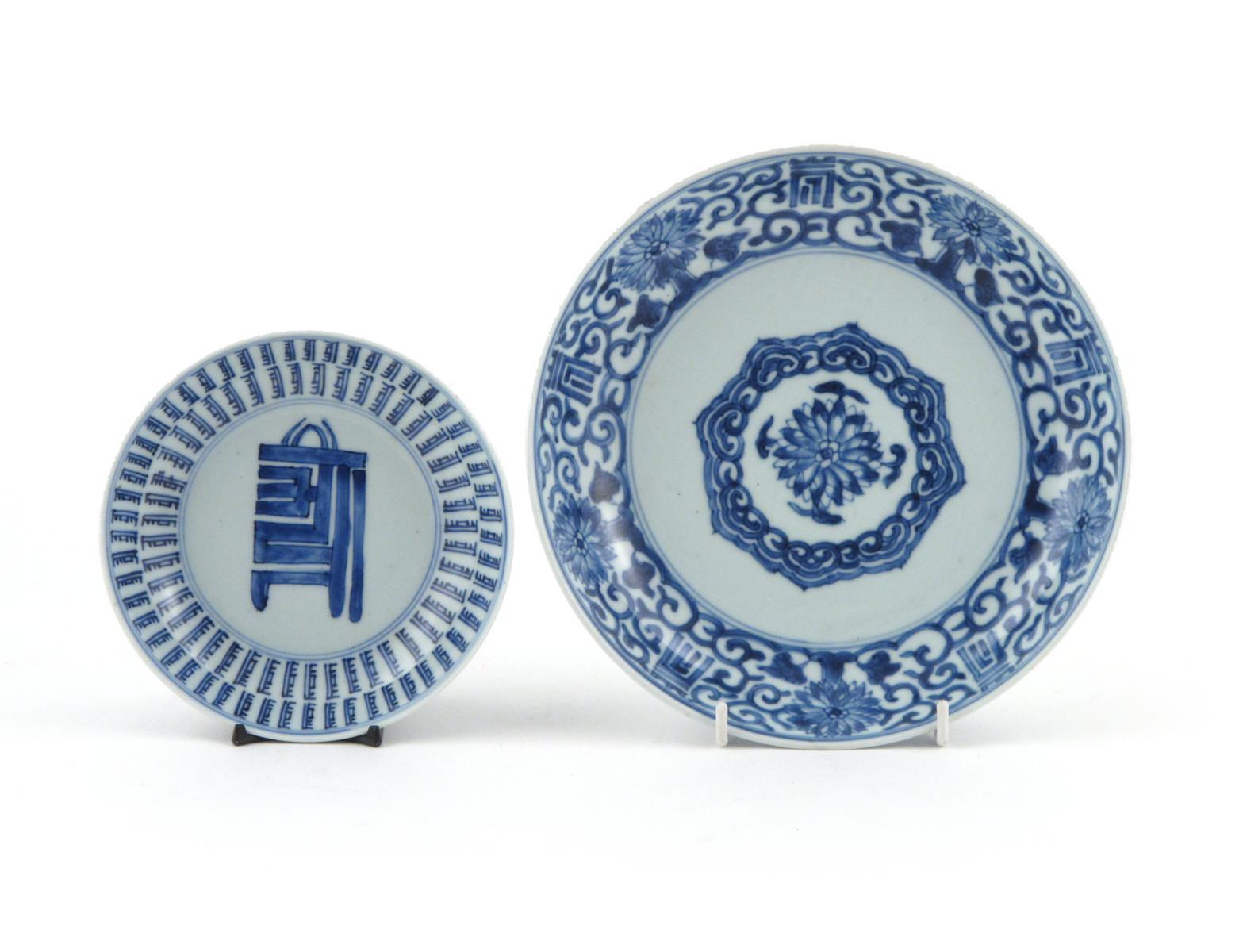 Two Chinese blue and white saucer dishes each with a Yongzheng mark and of the period 1723-35, one decorated with lanca, the other with flowers, scrolls and shou characters, 20cm. (2)