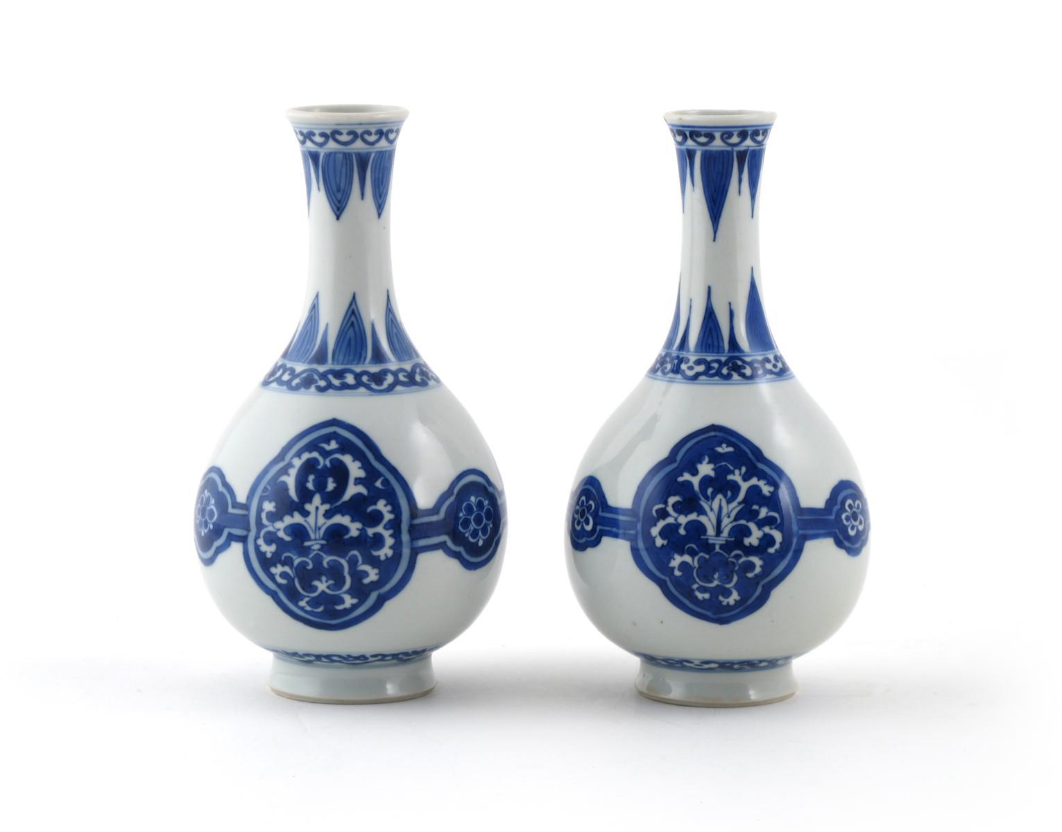 A pair of Chinese blue and white bottle vases Kangxi 1662-1722, each painted with three octafoil panels, enclosing scrolling foliage, the necks with bands of ruyi-heads and stylized petals, 19.5cm. (2)
