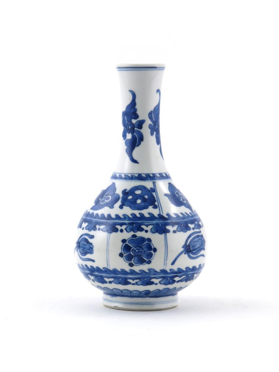 A Chinese blue and white small bottle vase Kangxi 1662-1722, brightly painted with panels of stylized flowers, 19.2cm.