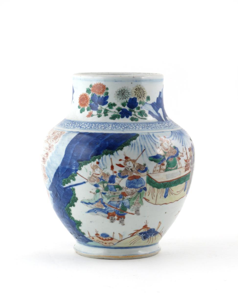 A Chinese wucai ovoid vase 17th century, decorated with warriors at a table and in a garden, a little wear and footrim chips, 28cm.