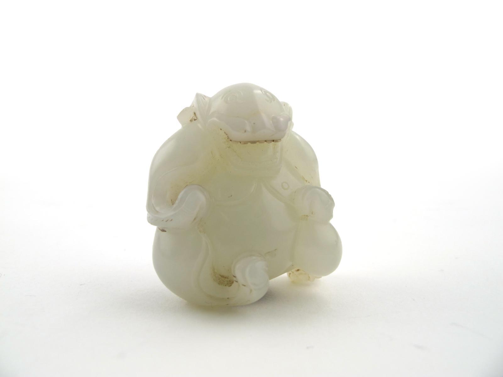 A Chinese white jade carving 19th century, formed as a stylized bear baring its teeth, pierced at the back of the head for suspension, 4cm.