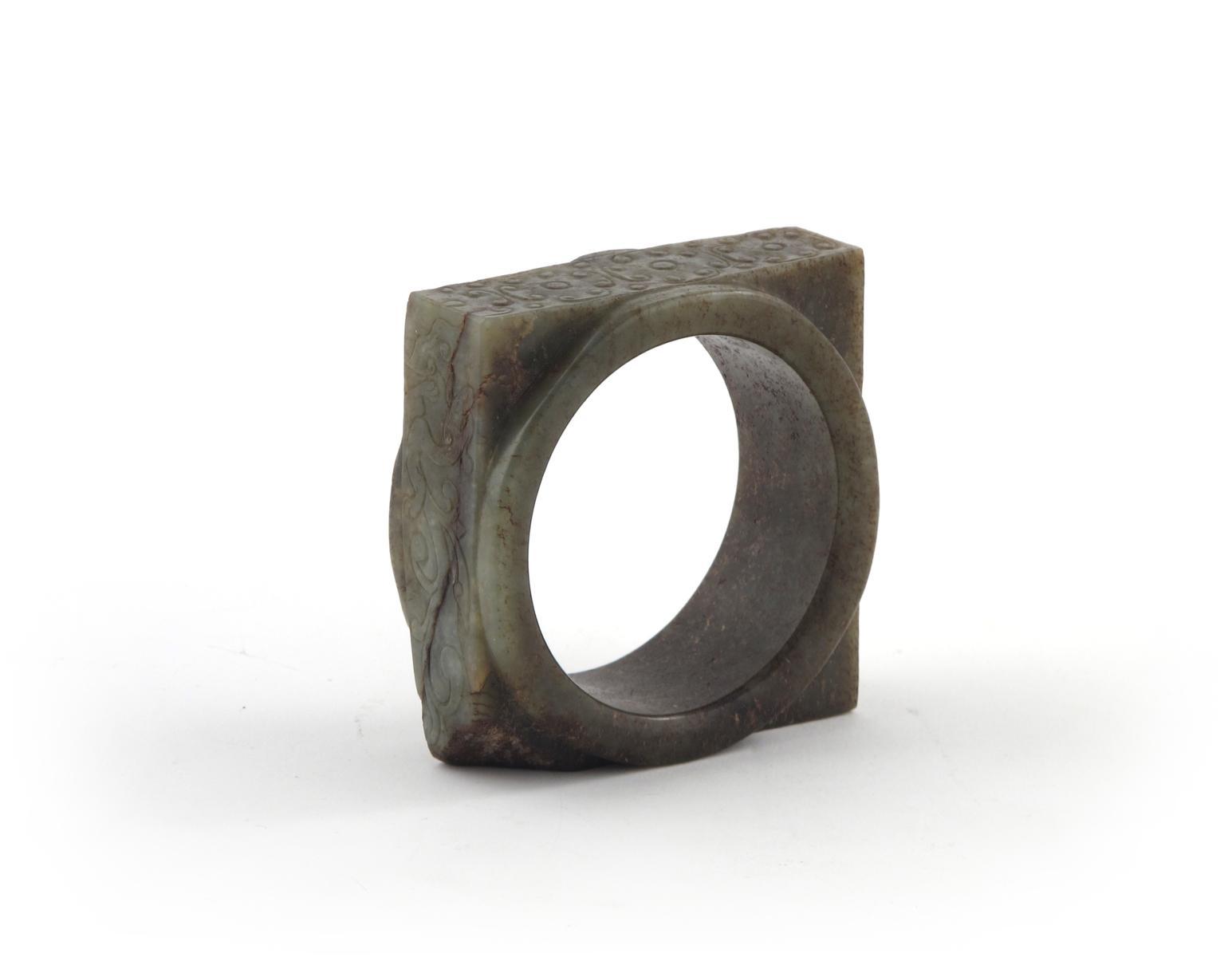 A Chinese celadon jade cong probably Western Zhou dynasty, of flattened form, carved with flowerheads and dragons, large chips to the rim and corners, 9.7cm.