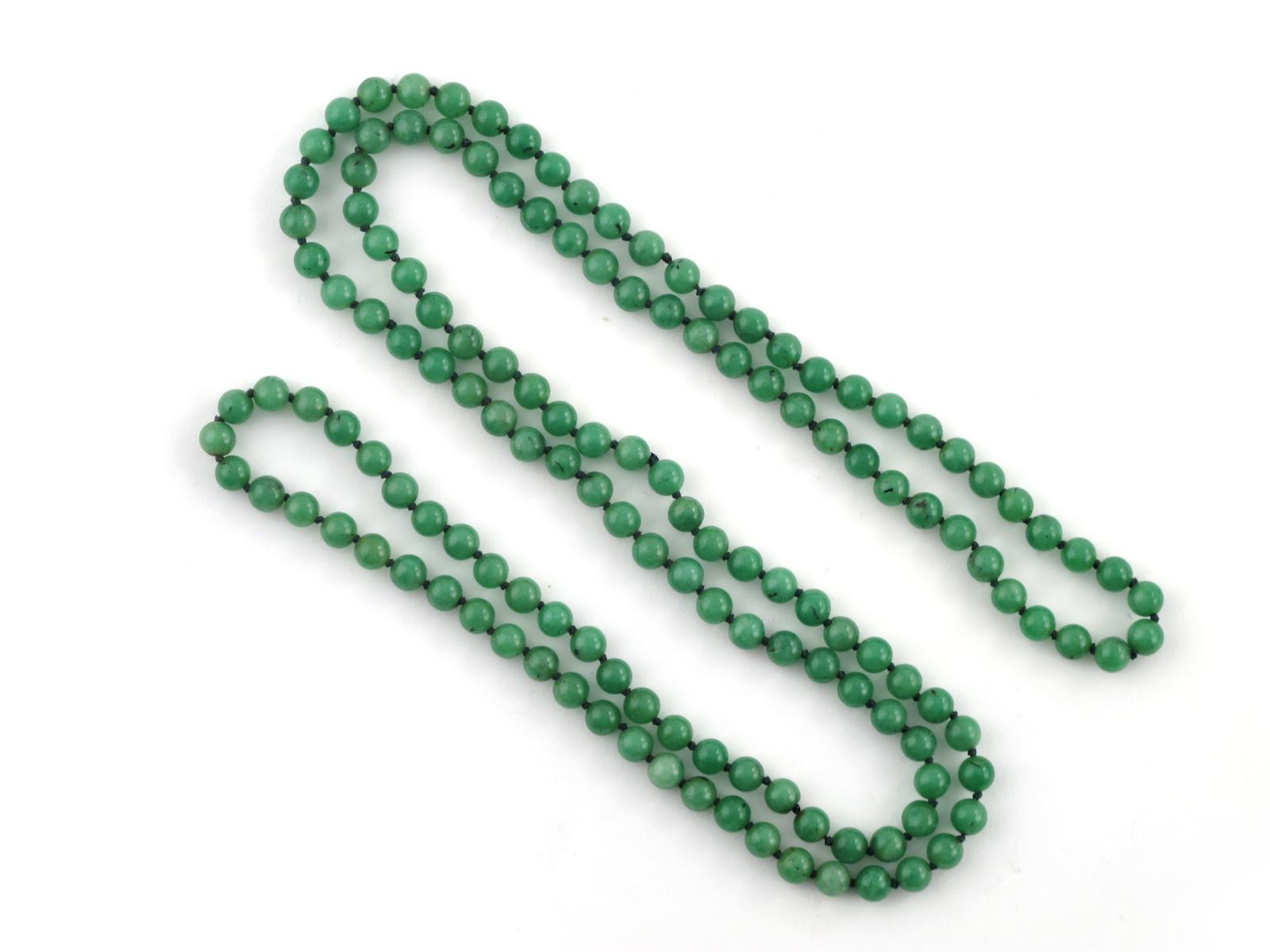 A string of one hundred and forty three Chinese jadeite beads, the stone a rich apple-green with small dark inclusions, 68.8cm.
