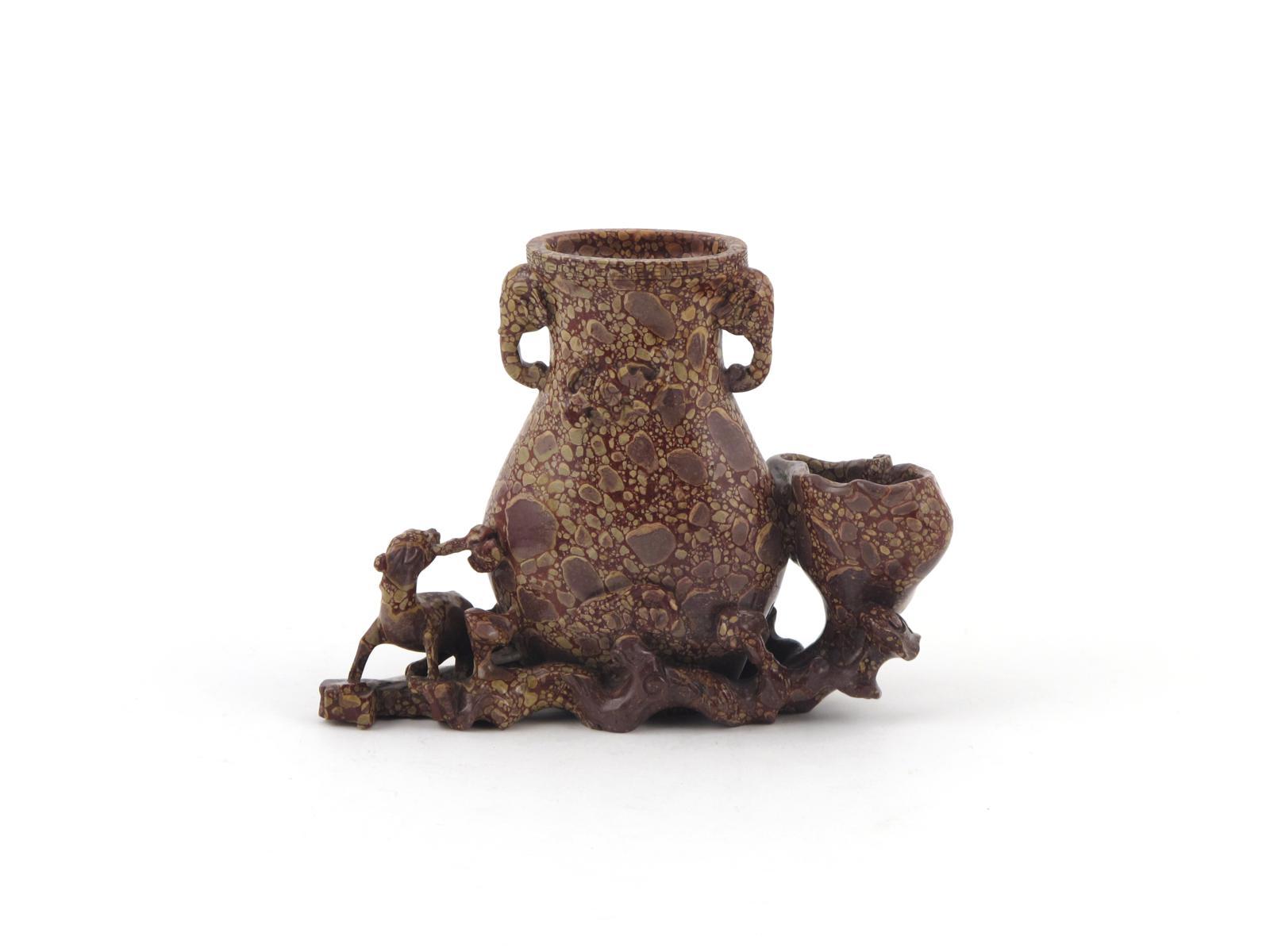 A Chinese pudding stone vase 18th century, carved with animal head handles and a bat below the neck, all supported around branches of lingzhi, and with a small deer to one side, some restoration, 13.6cm.