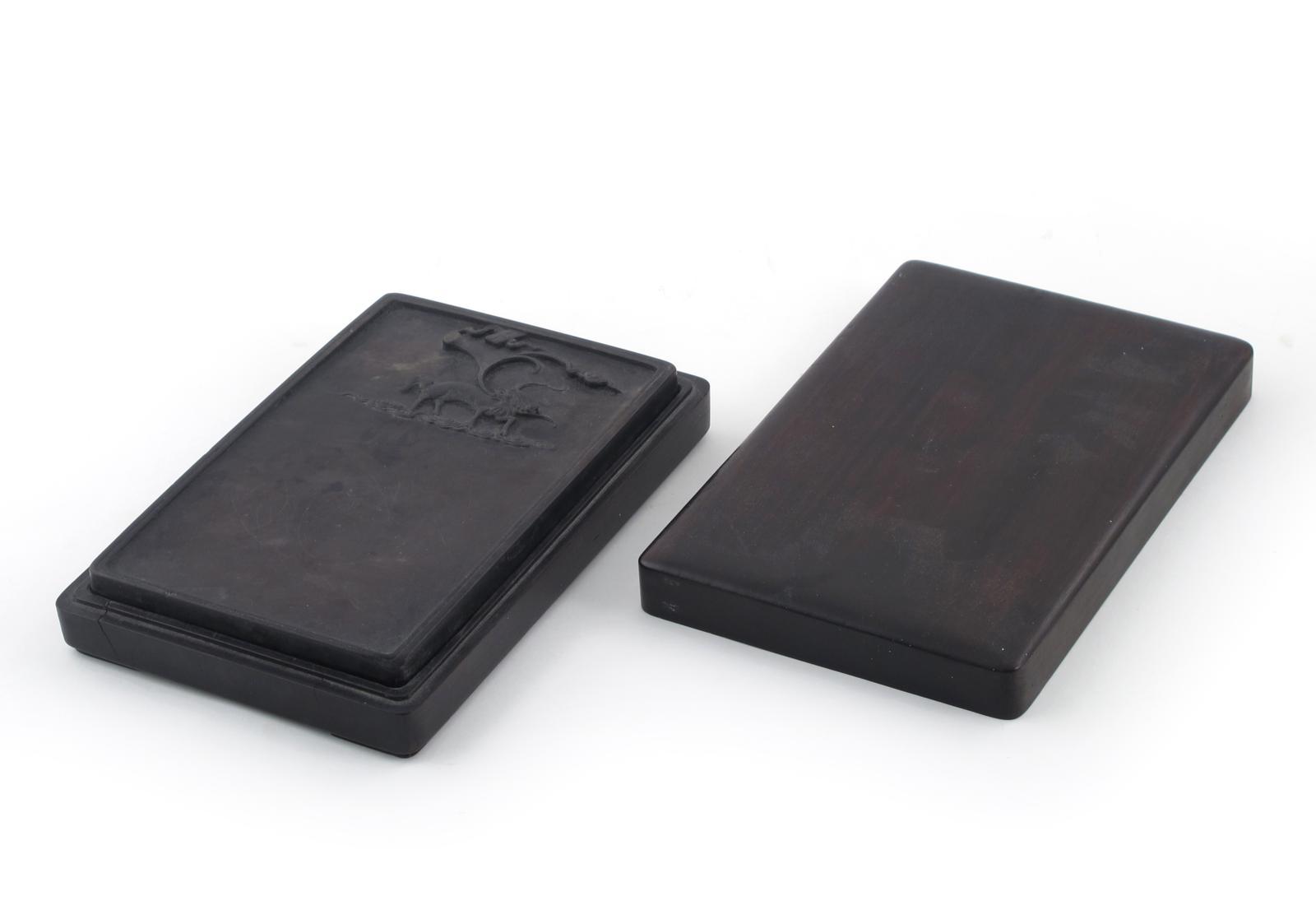 A Chinese ink stone 19th century or earlier, the rectangular form carved with a mythical beast conjuring clouds and auspicious things from its jaws, contained in a hardwood box, surface wear and chips to the corners, cracking to the box, 18cm. (3)