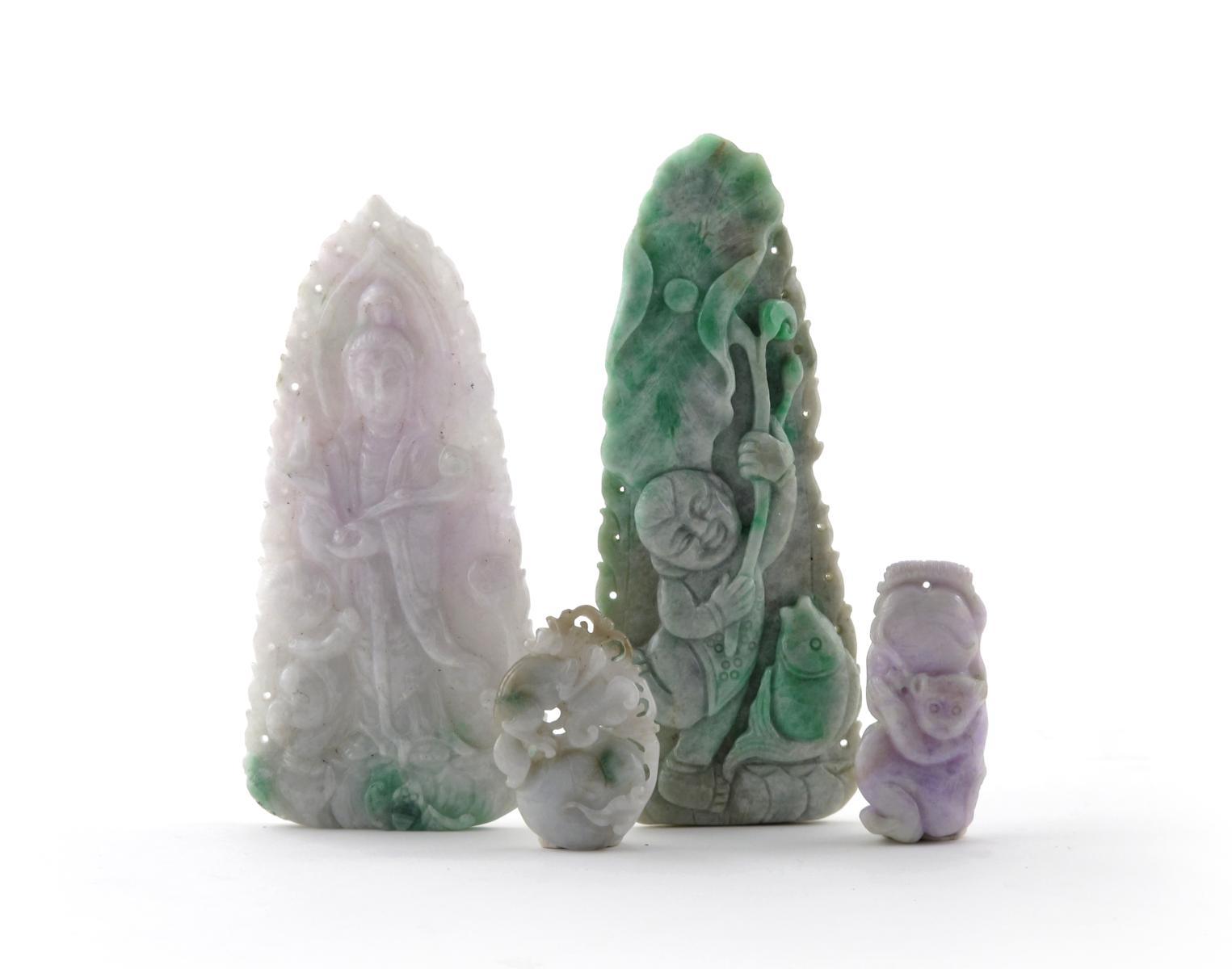 Four Chinese jadeite carvings 19th century, one of a boy holding a large lotus leaf above a small fish, one of Guanyin carrying a ruyi sceptre with a small boy clinging to her robes, a lavender jadeite pendant of a monkey holding a large peach, and the last a squirrel clambering over a fruit, 12cm max. (4)