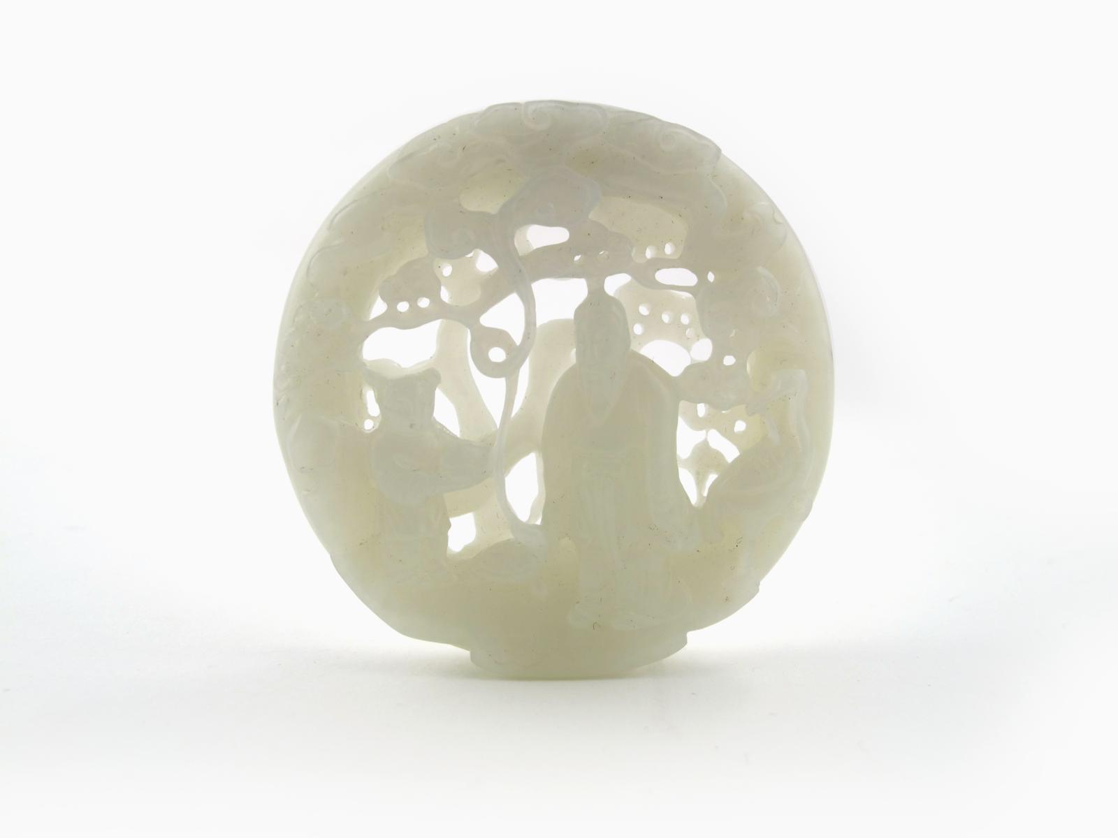 A Chinese white jade roundel 19th/20th century, delicately reticulated and carved with a figure between a crane and a tortoise amidst fungi and pine, and with an attendant at his side, the reverse with pine and bamboo, 5.2cm.