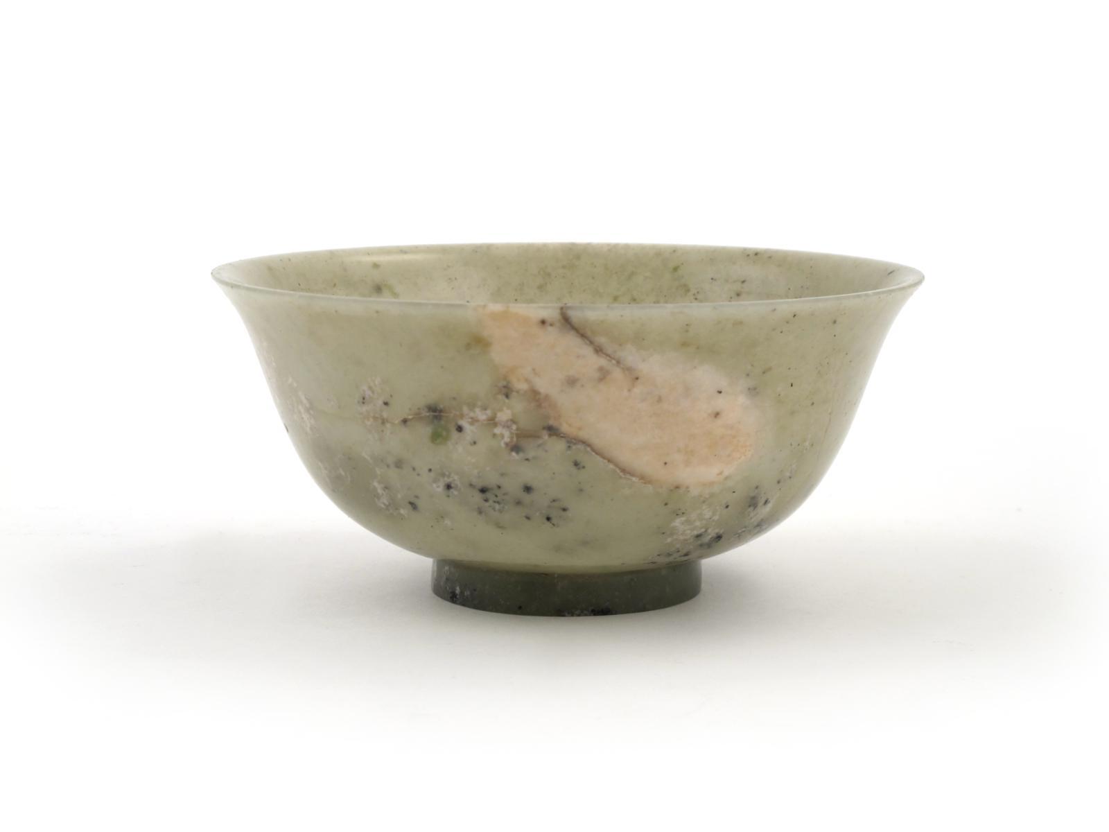A Chinese celadon jade bowl Qianlong six character mark and of the period 1736-95, the bowl with a flared rim, raised on a neat square-section foot, the stone with grey and cream mottling and inclusions, small rim chips and faults to the stone, 15.5cm.