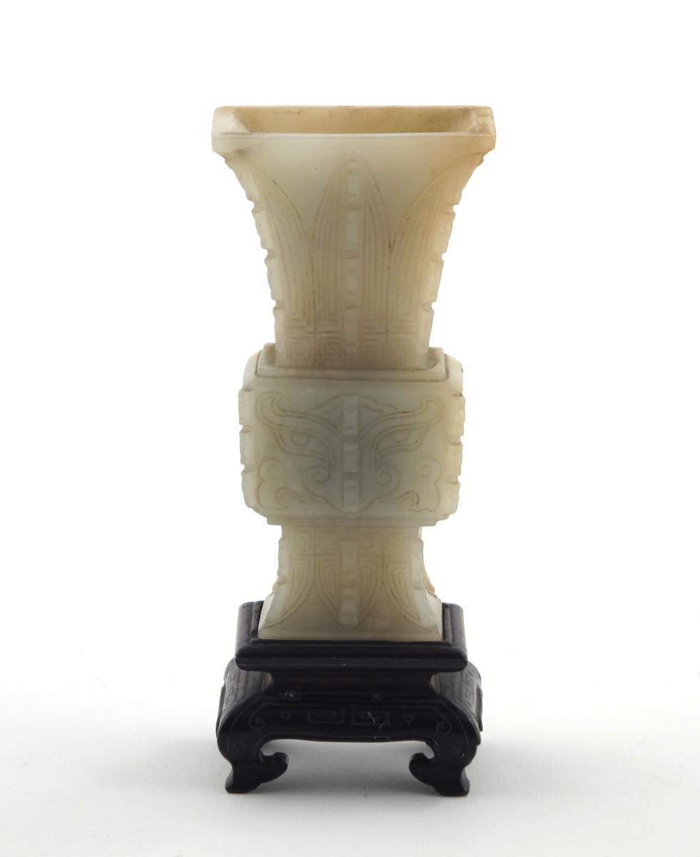 A small Chinese pale celadon jade archaistic vase 19th century, carved with stylized taotie, the wood stand inlaid with metal wire, 9.9cm. (2)
