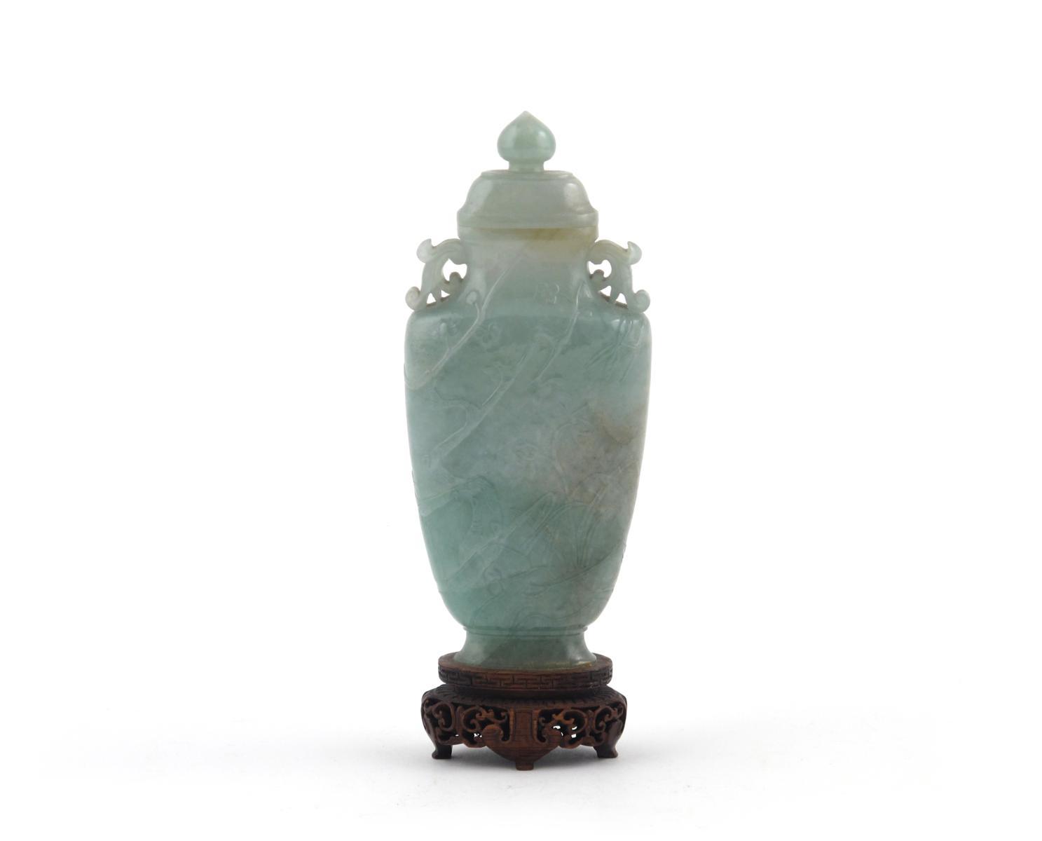A Chinese jadeite vase and cover 19th or early 20th century, carved in shallow relief with prunus, bamboo and iris beneath, carved hardwood stand, 14.5cm. (2)