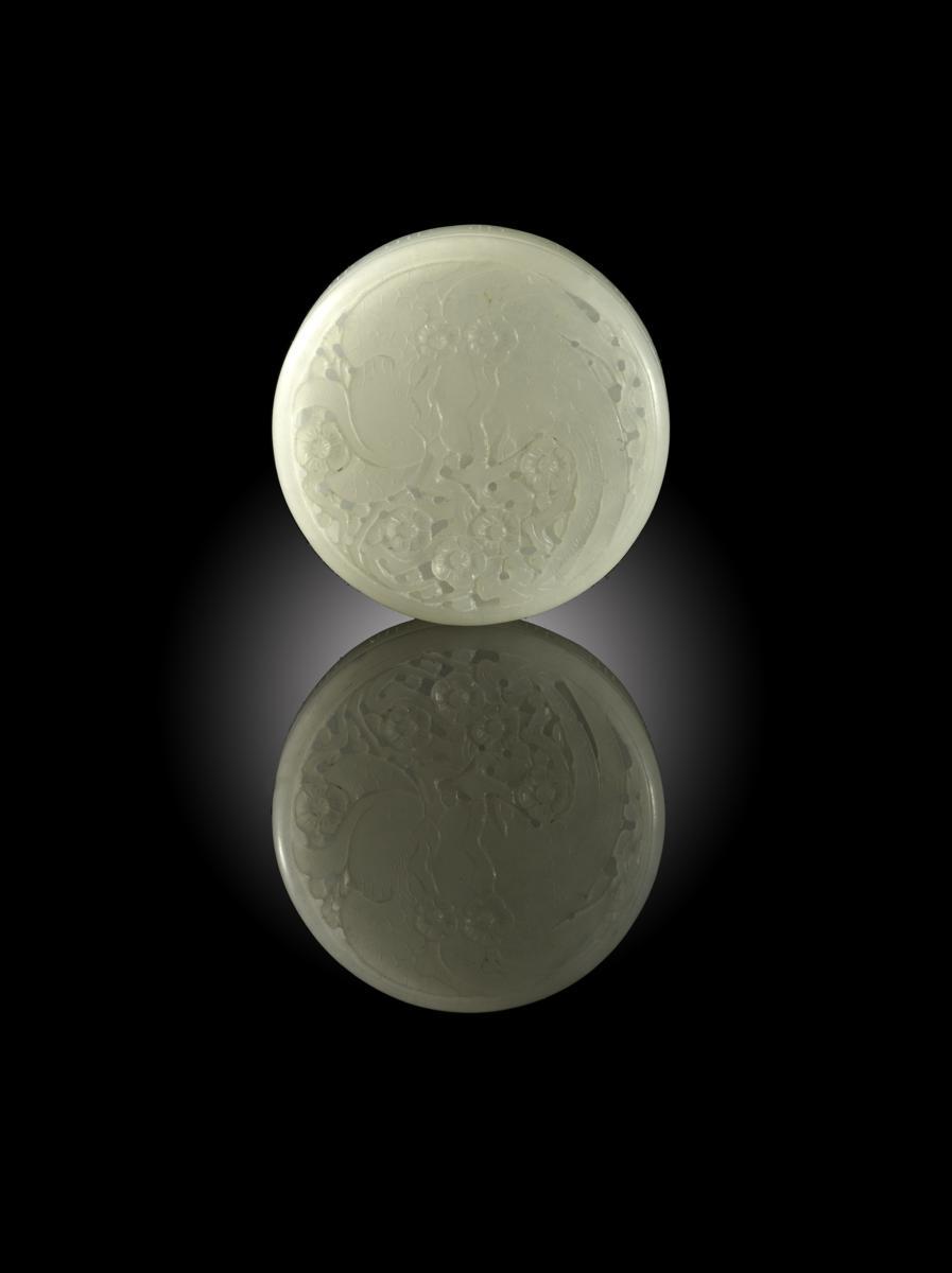 A small Chinese white jade circular box and cover, the reticulated cover decorated with a phoenix amidst flowers, the sides with a key fret band, slight polishing to the underside, 5.2cm. (2)