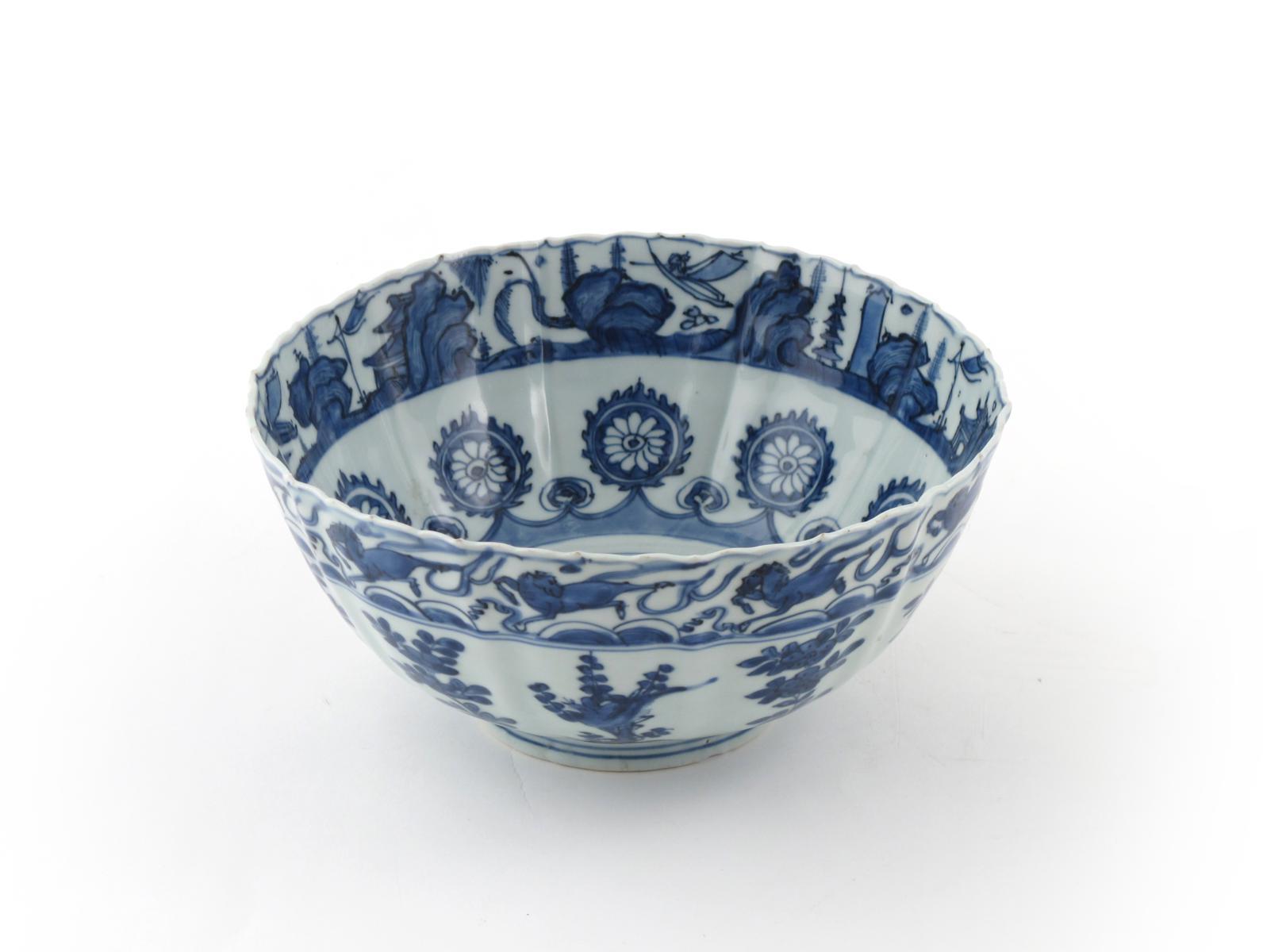 A Chinese blue and white fluted bowl Wanli c.1580, with a foliate rim, and painted with ten flying horses leaping over waves above flowering branches, the interior with a mountain river scene and and wide band of flaming wheels and a further band of mountains, pagodas and small boats, the base with a four character seal mark which reads fu gui jia qi (beautiful vessel for the rich and honourable), 21cm dia.
