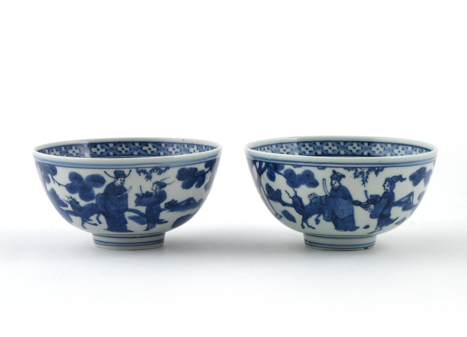 A pair of Chinese blue and white porcelain small bowls Wanli c.1580, both painted with scenes of a horse with its rider, dignitaries carrying hu tablets and a deer amidst trees, pagodas and rocks, the interior roundels each painted with a single figure in a fenced garden, below an inner rim of cross diaper, each base with a two character Zhen Yi mark, 11.8cm. (2)