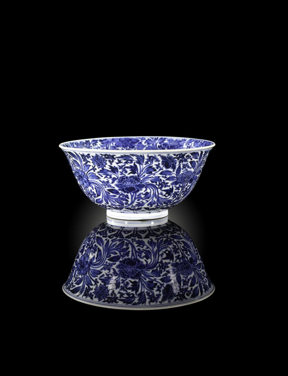 A Chinese blue and white bowl six character Jiajing mark and of the period 1522-1566, brightly painted with a continuous band of peony, hibiscus, lotus and other flowers amidst scrolling foliage, the interior with a floral roundel and a wide band to the border, 24.2cm.