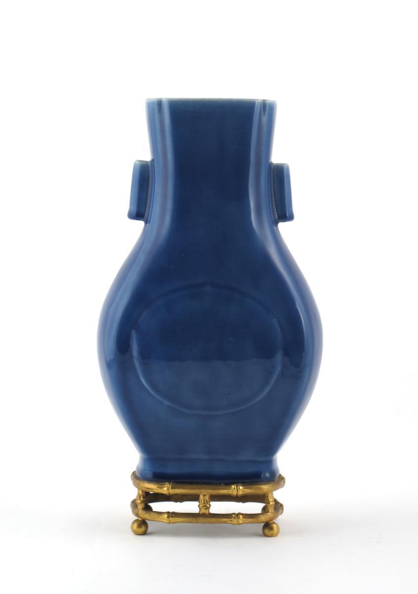 A Chinese blue glazed vase fanghu six character Guangxu mark and probably of the period, glued to a simulated bamboo gilt metal stand, 39cm.