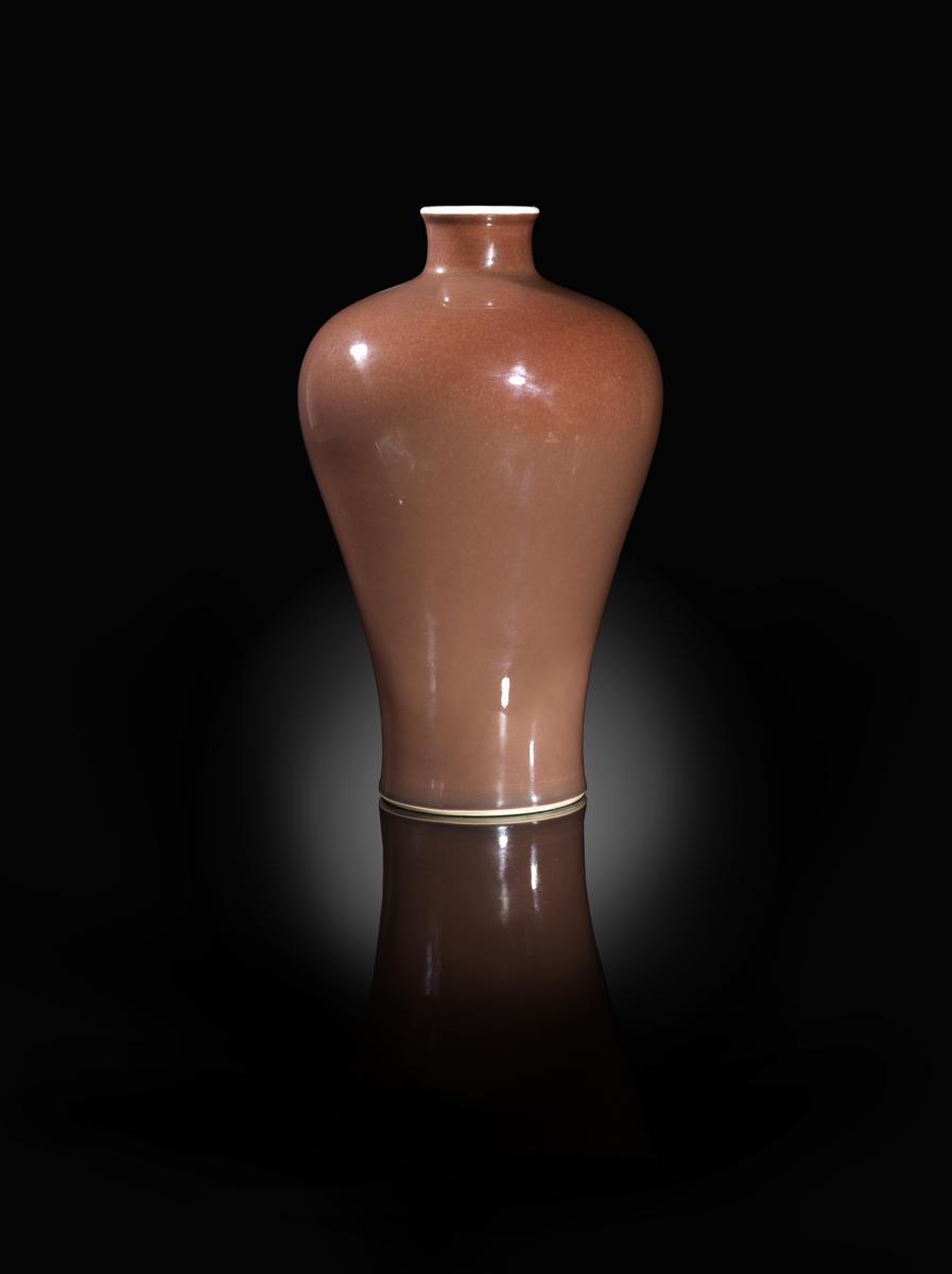 A Chinese monochrome meiping Qianlong four character seal mark and probably of the period, decorated with an even copper-red glaze beneath a white rim, 29.4cm.