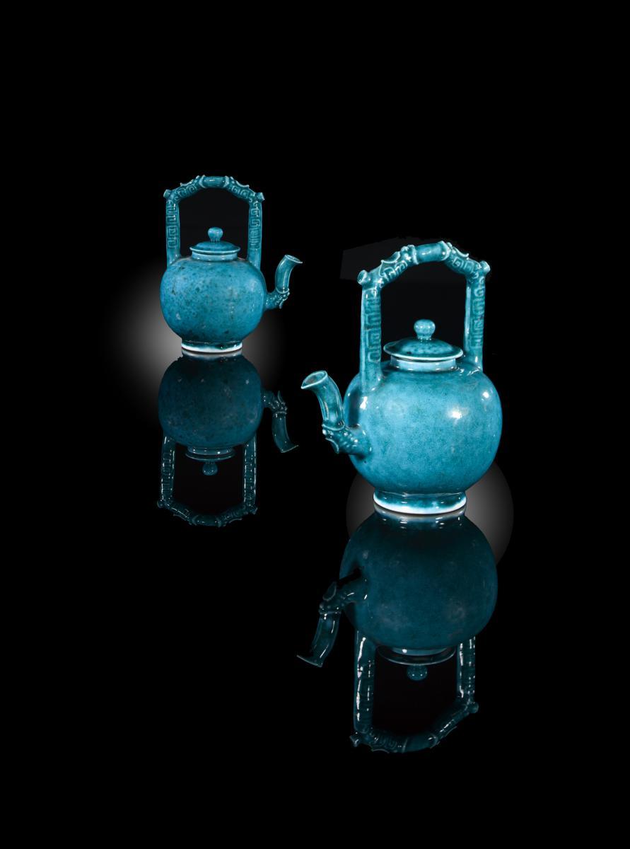 A pair of rare Chinese turquoise glazed teapots and covers Kangxi 1662-1722