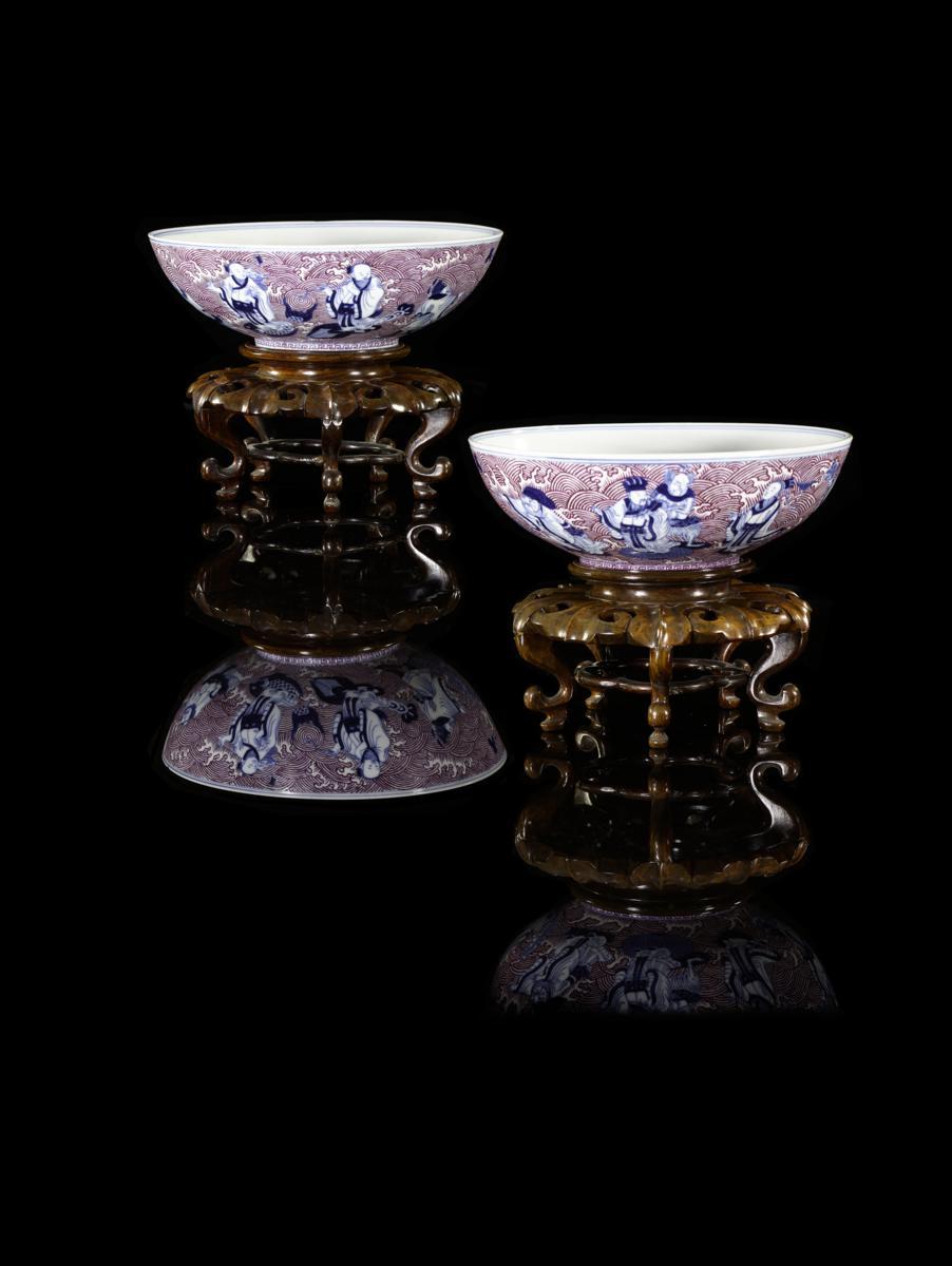 A rare pair of Chinese Immortals bowls six character Guangxu marks and of the period 1875-1908, each painted in underglaze blue and overglaze puce with the Eight Immortals to the exteriors and with Shoulao holding a staff beside his deer to the interior, one with a rim chip, another with a tiny speck to the rim, each with a hardwood stand, 22.1cm dia. (4)
