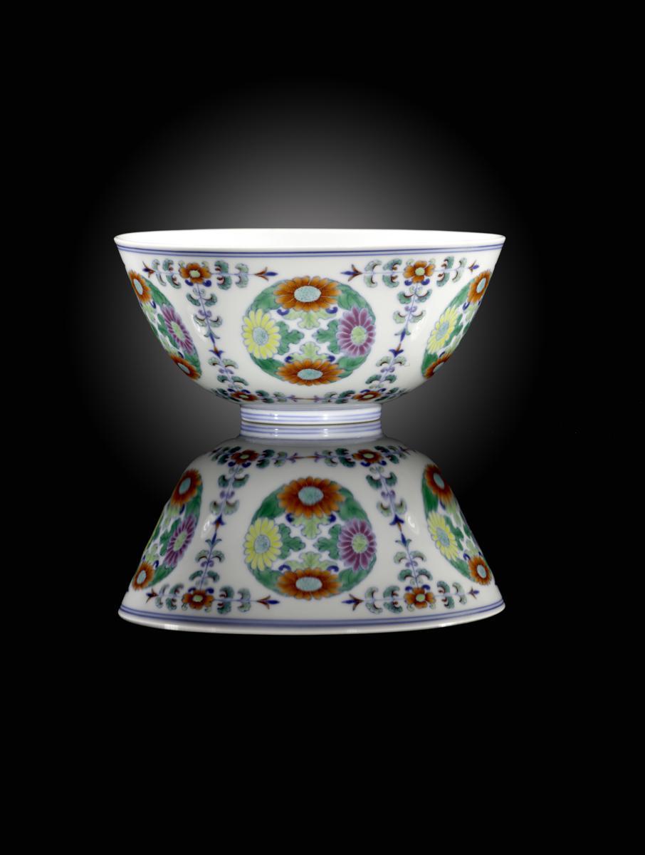 A rare Chinese doucai medallion bowl six character Yongzheng mark and of the period 1723-35, the exterior brightly enamelled with five roundels, each with four chrysanthemum heads and leaves, divided by stylized leaf borders, the interior white glazed, a section broken out and well restored with no over-spraying, 14.6cm.