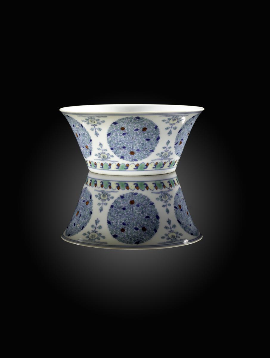 A good Chinese doucai flared bowl six character Daoguang mark and of the period 1821-50, finely painted with five roundels of flowering trees divided by stylized pomegranate above a band of green and yellow lappets, 15cm.
