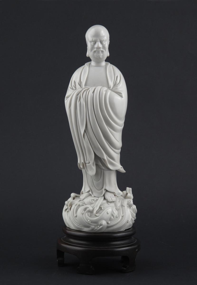 A Chinese blanc de Chine figure of a monk 19th/20th century, standing on scrolling waves, wearing flowing robes, impressed factory marks, together with a wood stand, chips to the stand, 34.4cm. (2)
