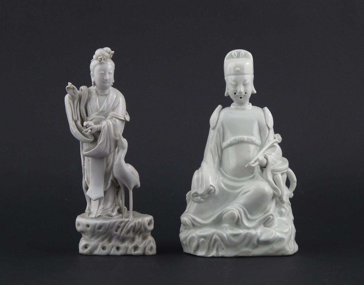 Two Chinese blanc de Chine figures 17th/18th century, one a standing figure of Guanyin beside a crane, the other of a seated official holding a sceptre, extensive damages, 24cm. (2)