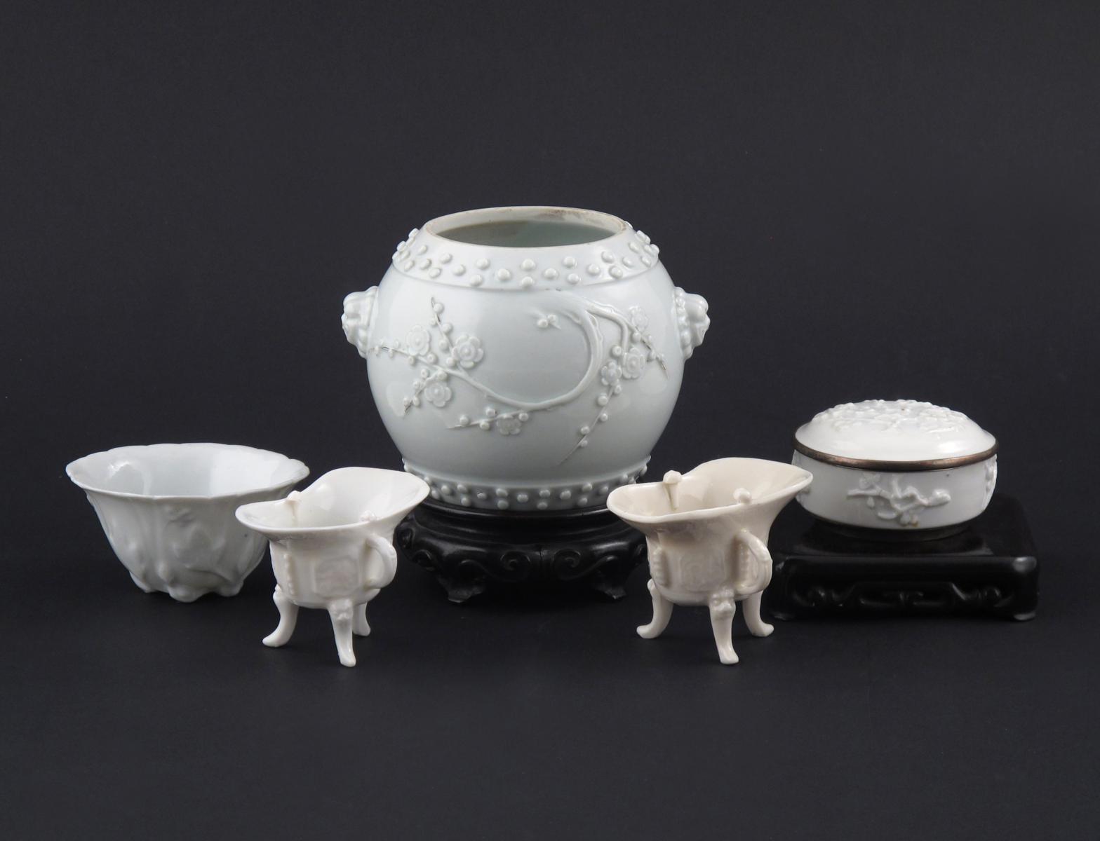 Five Chinese blanc de Chine items 18th century and later, variously formed as a libation cup, a brush washer, a round box and cover and two small tripod censers, together with two wood stands, some damages, 13.5cm max. (8)