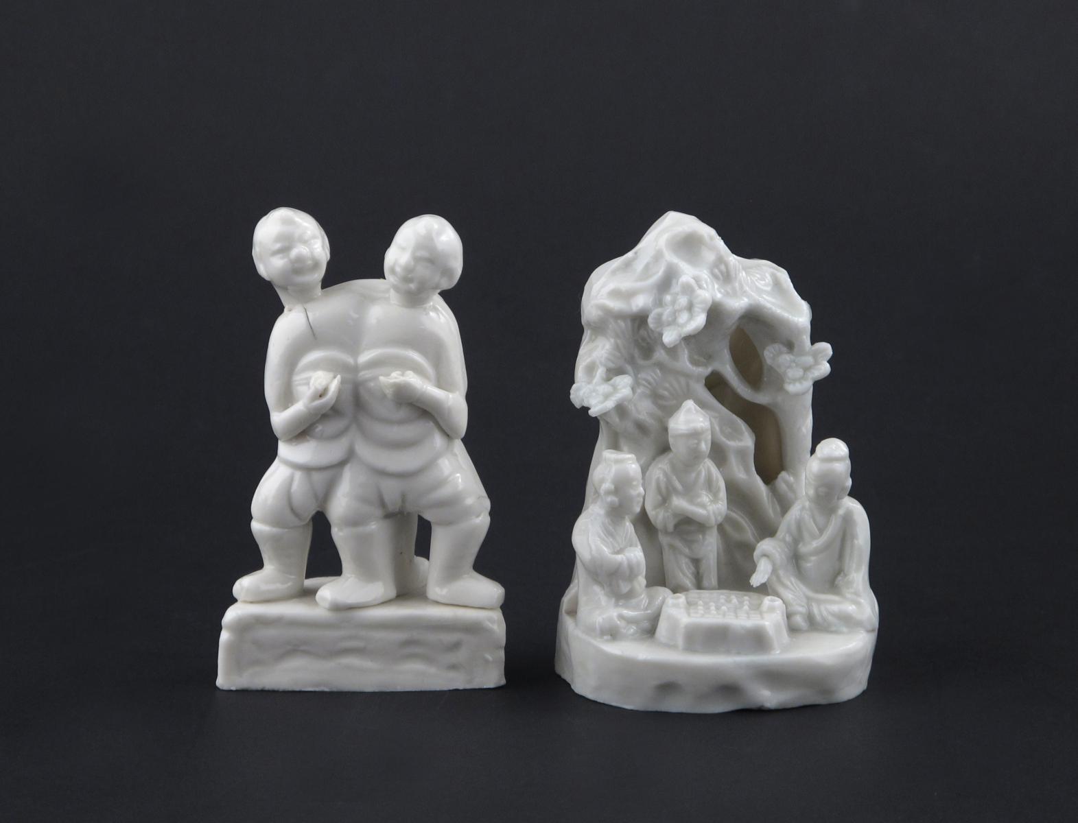 Two small Chinese blanc de Chine figure groups c.1700, one of the laughing twins, the other of two figures and an attendant playing chess beneath a rocky outcrop, minor faults, 10,2cm. (2)