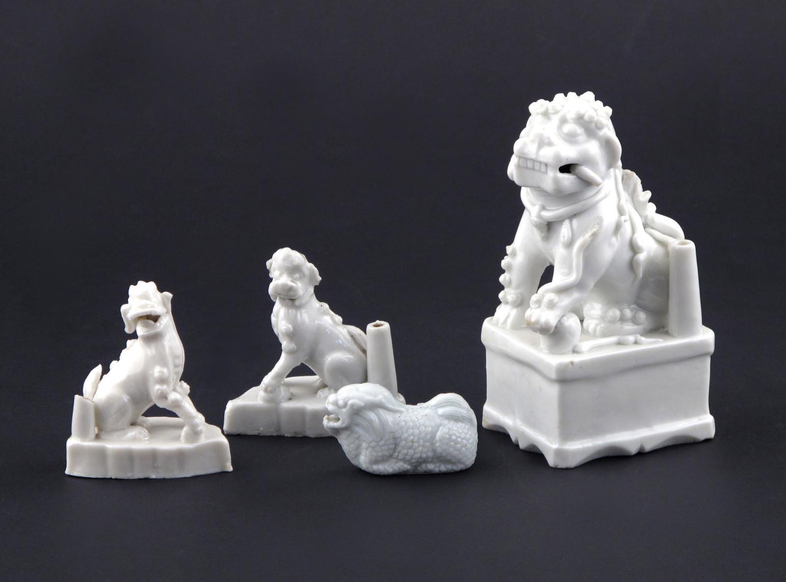 Three Chinese blanc de Chine models of Buddhist lion dogs c.1700, and a porcelain figure of a mythical creature, damages, 13.5cm max. (4)