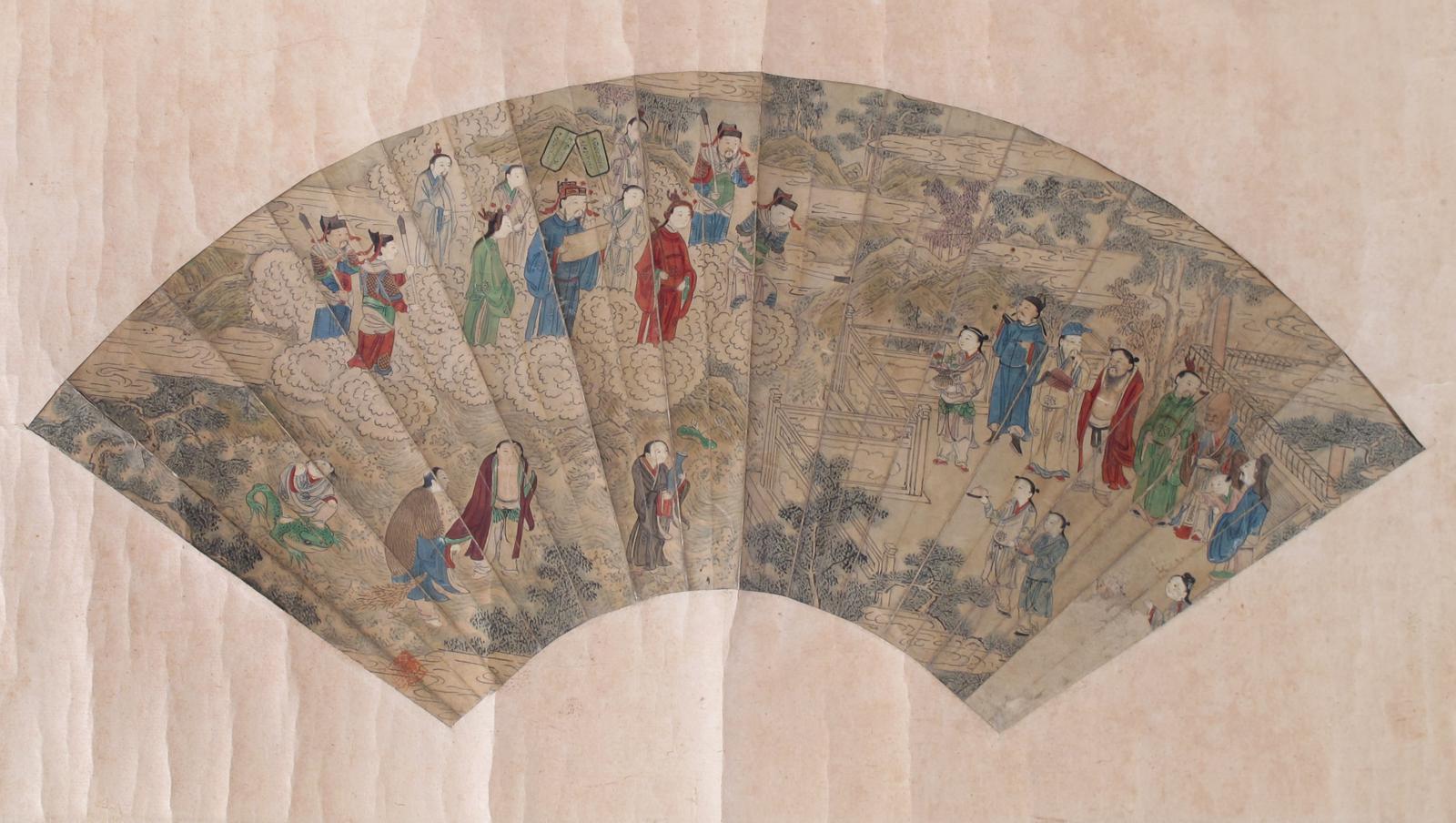 A Chinese paper fan panel, depicting figures on a terrace and amidst clouds, mounted on a small scroll, damages, 47cm across.