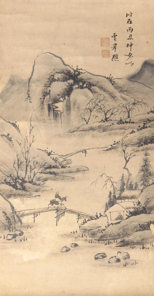 A Korean scroll painting, depicting a figure on a bridge in a mountain landscape, beneath calligraphy with two artist's seals, 54cm x 28cm.