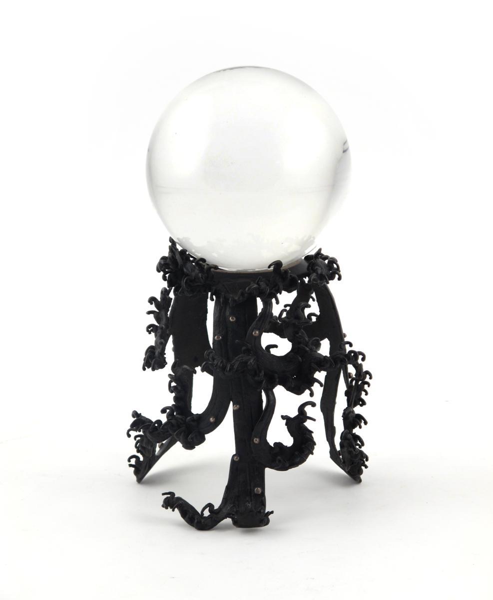 A Japanese bronze tripod stand Meiji 1868-1912, supporting a large glass sphere, the stand cast as breaking waves with silvered droplets, 28cm overall. (2)