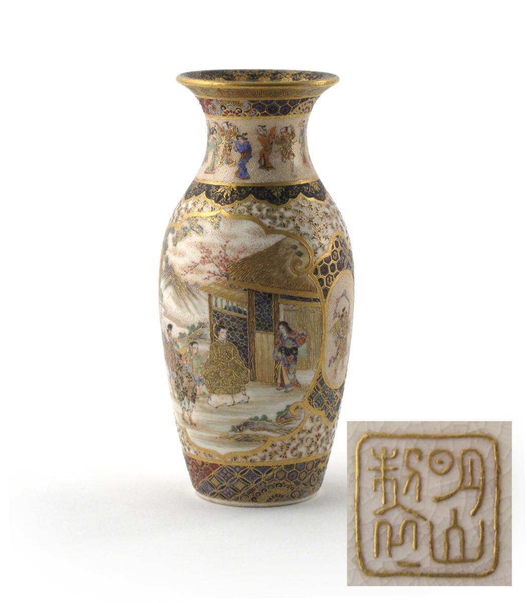 A Japanese Satsuma vase c.1900, well decorated with two large and two small panels, containing figures at play and in landscapes on a ground of scrolling foliage, the neck with a band of dancers, the base with a gilt signature for Yabu Meizan, 12cm.