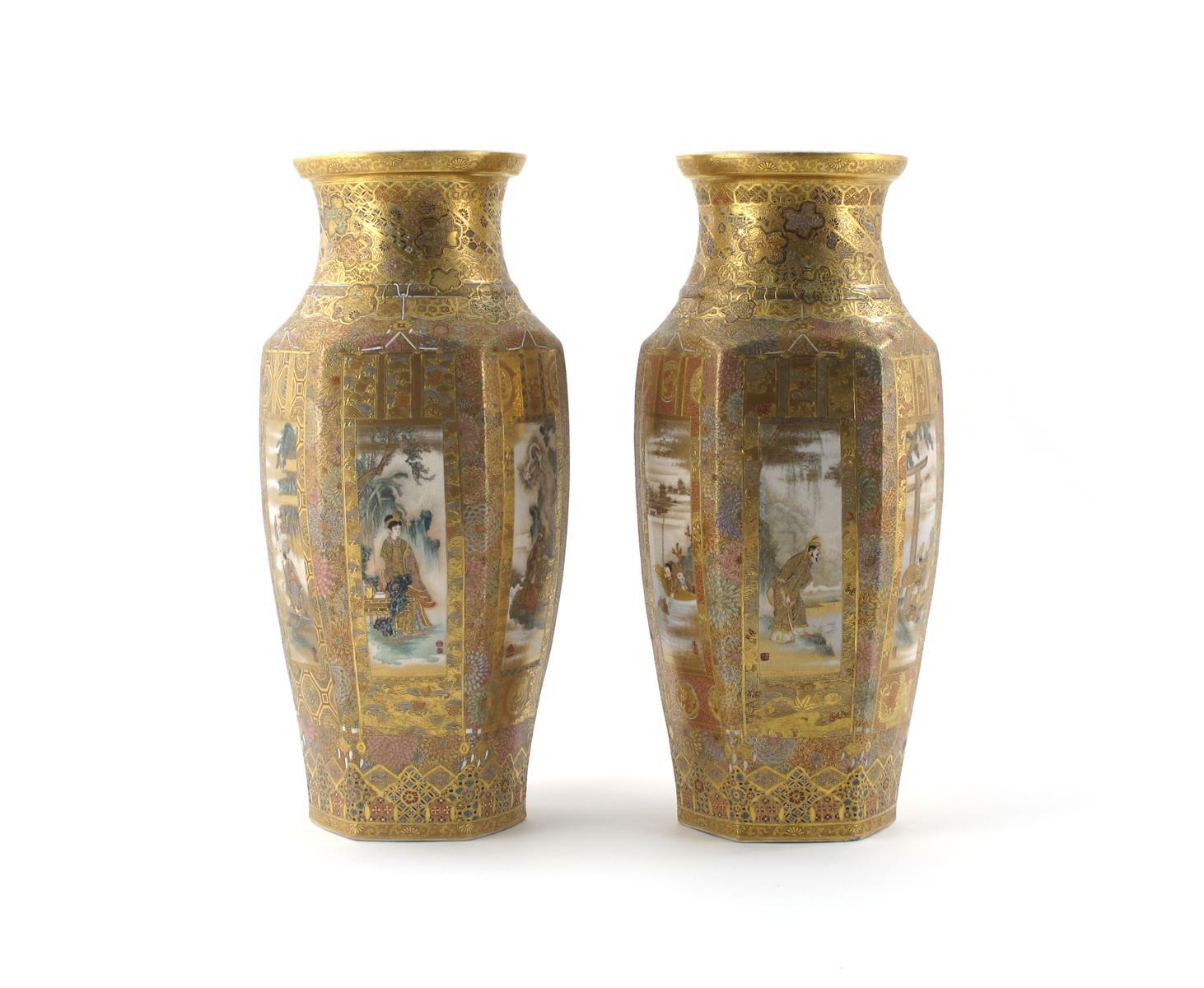 A large and rare pair of Japanese Satsuma Kinkozan vases c.1900, the hexagonal bodies painted with panels of figures, the ground elaborately painted with chrysanthemum and brocade designs, variously signed Sozan, Okahashi and Fuzan (?), 36cm. (2)