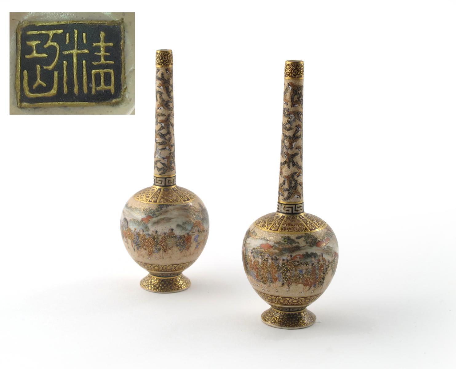 A pair of small Japanese Satsuma vases c.1900, each ovoid body painted with many figures in a procession beneath tapering, cylindrical necks with birds in flight, each base with a seal mark for Seikozan, one neck with a section broken out and repaired, 12cm. (2)