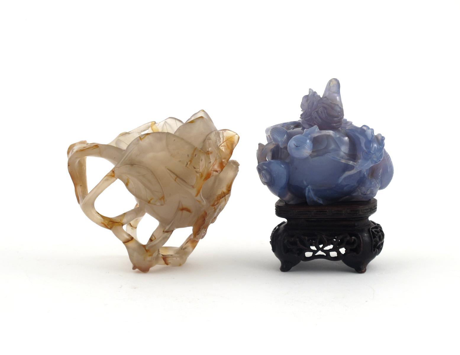 A Chinese agate vase 19th century, formed as a flower supported by leafy stems on which a bird is perched, and a hardstone water pot and cover, encircled by a sinuous dragon, a flaming pearl and a lingzhi fungus, raised on a wood stand, 10.2cm. (4)