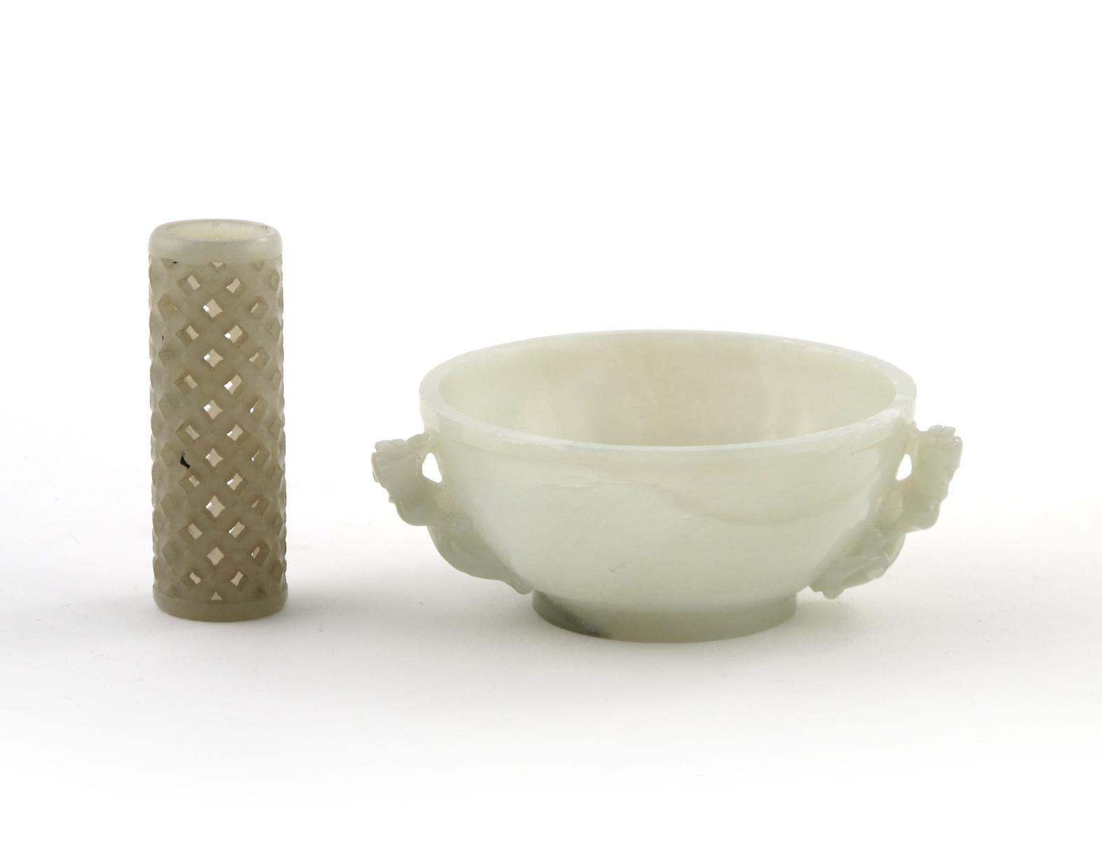 A Chinese celadon jade bowl, carved with dragon handles, and a reticulated celadon jade cylinder, 11.5cm. (2)