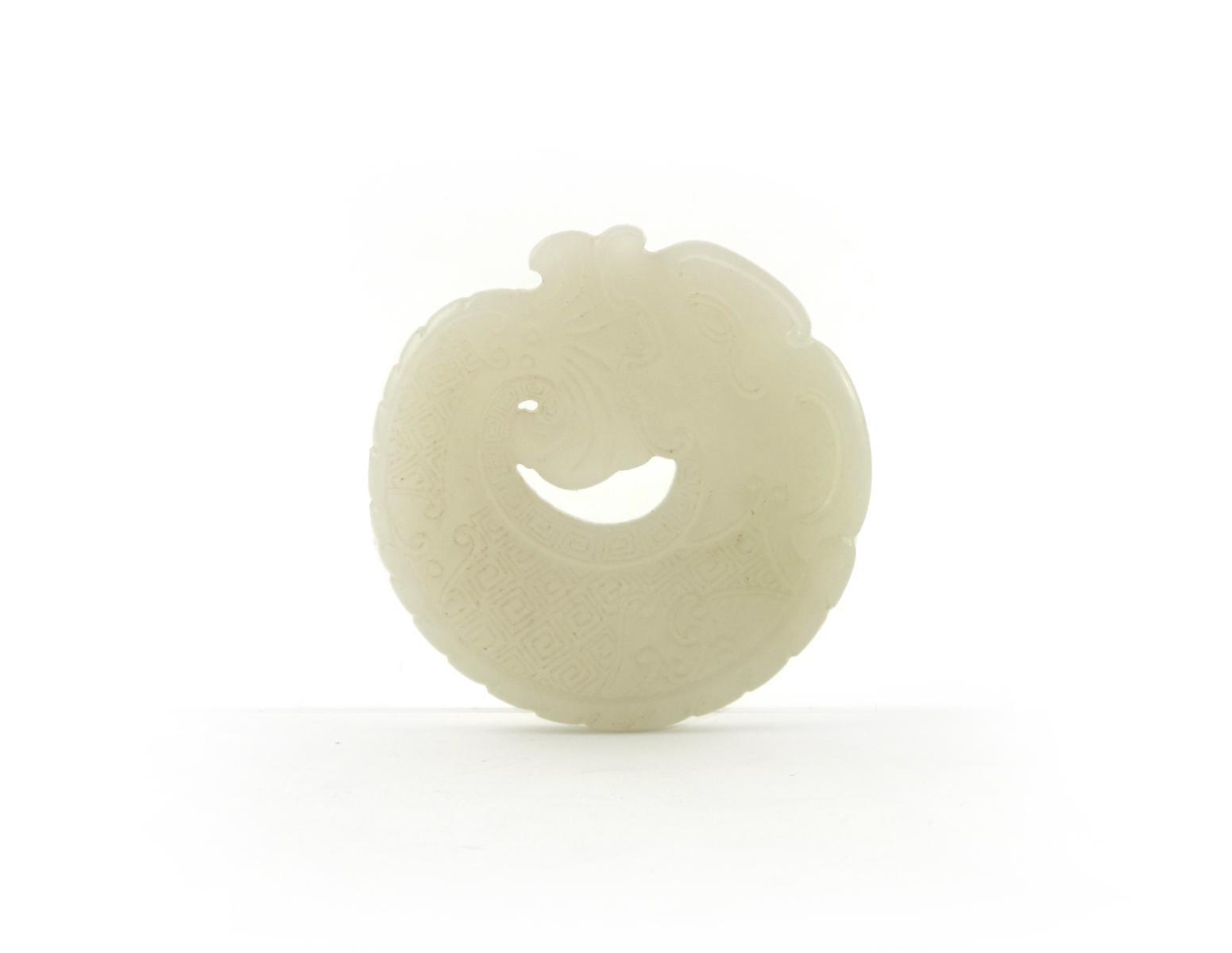 A Chinese white jade plaque, carved as a fish with its tail in its mouth, 5.5cm.