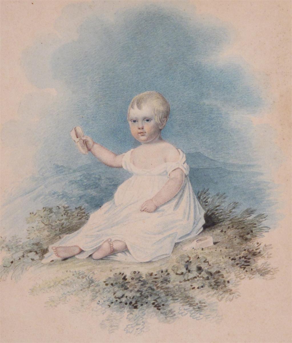 English School 19th Century A child seated in a landscape Watercolour 18.5 x 16cm; 7¼ x 6¼in With...