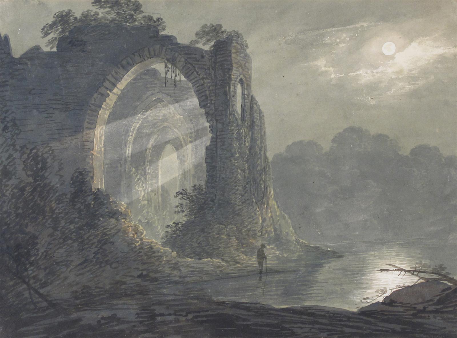 Wiliam Payne (c.1760 - c.1830) A ruined castle by moonlight Watercolour 29.5 x 40cm; 11½ x 15¾in