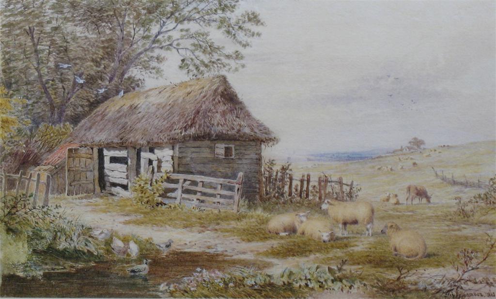 FREDERICK WILLIAMSON (c.1835-1900): Sheep and cattle by a thatched barn