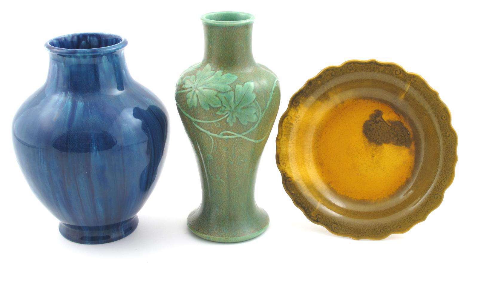 A Pilkington's Lancastrian vase, dated 1912, shape no.3064, ribbed form modelled in low relief with a grape vine design to shoulder, glazed green on a curdled green and ochre, a Pilkington's vase with streaked blue glaze ground and five various Pilkington's dishes impressed marks, some with damages 25cm. high