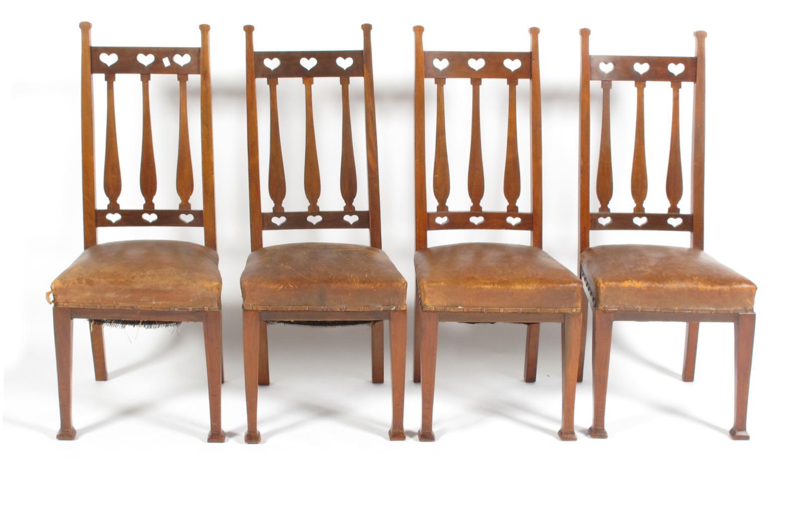 A set of four mahogany chairs, probably Shapland & Petter, each with carved, pierced heart motif to the back splats, with leather seats unsigned 106cm. high Provenance The Albert E Wade Collection